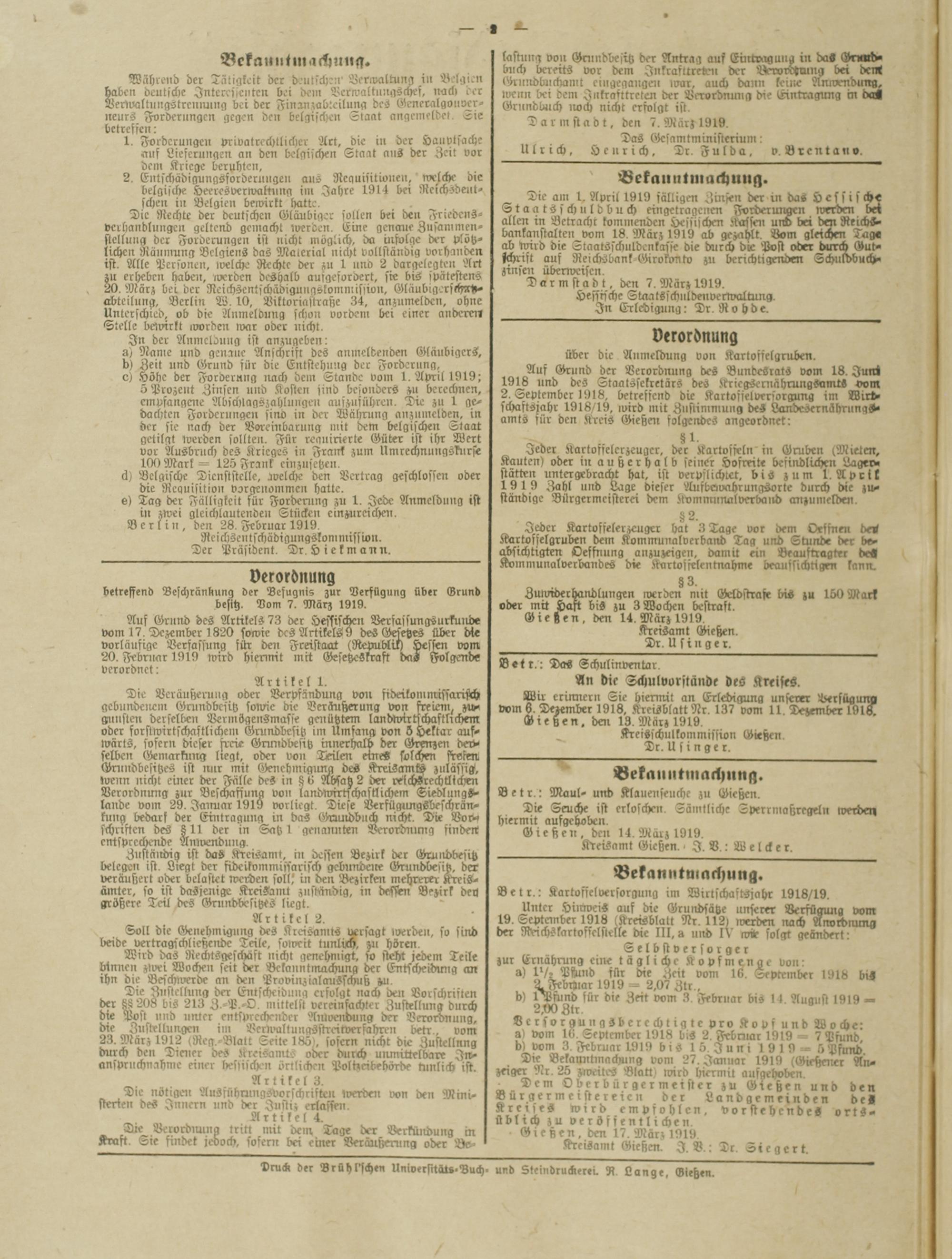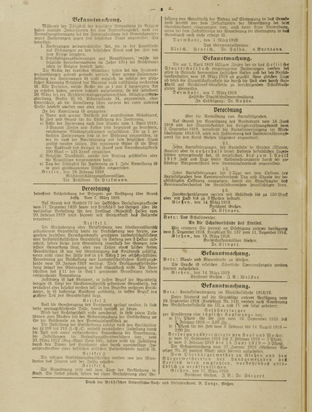 Amtsverkündigungsblatt für die Provinzialdirektion Oberhessen und der Kreisämter Gießen, Friedberg, Büdingen, Lauterbach, Schotten und Alsfeld. 1919-1937