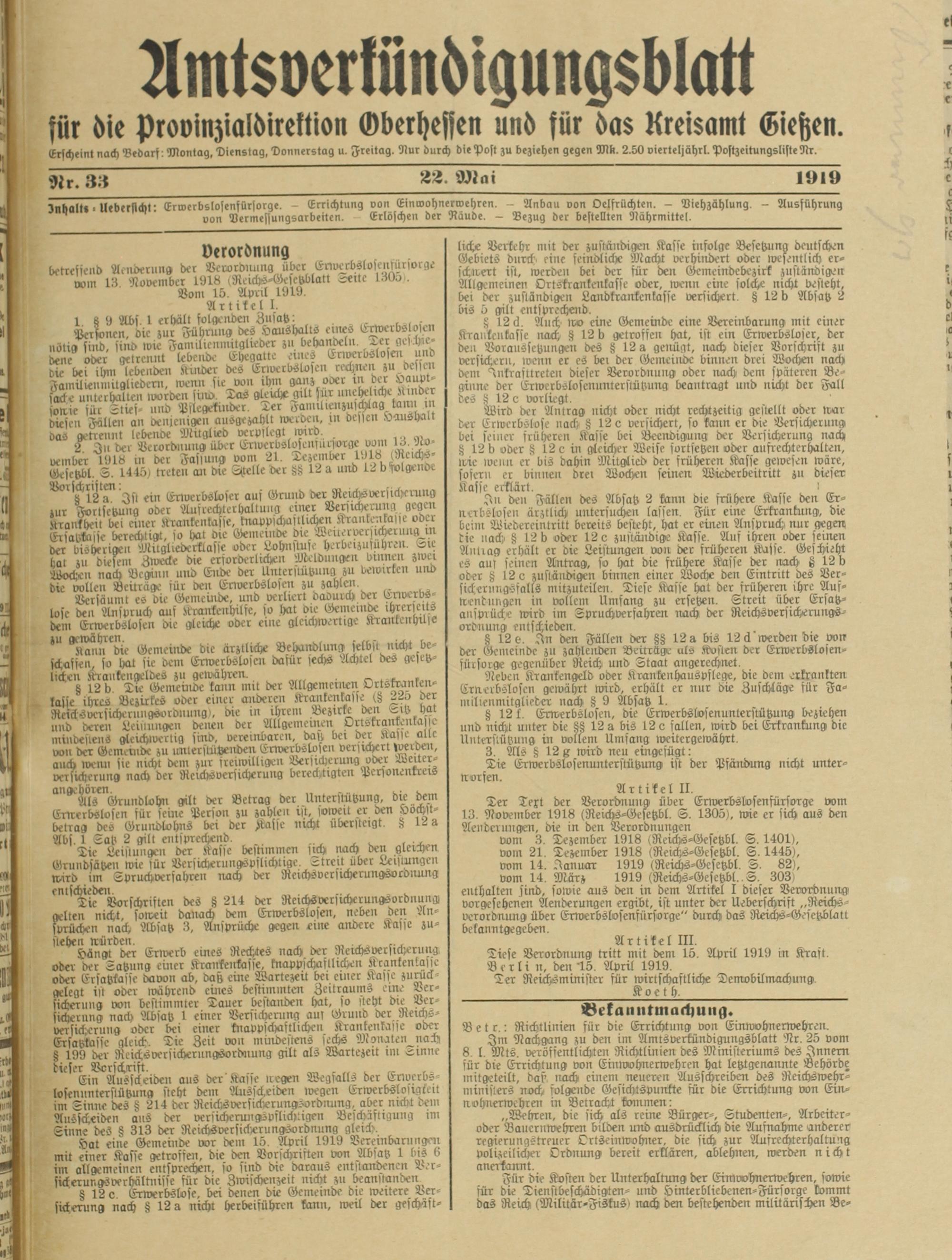 Amtsverkündigungsblatt für die Provinzialdirektion Oberhessen und der Kreisämter Gießen, Friedberg, Büdingen, Lauterbach, Schotten und Alsfeld. 1919-1937