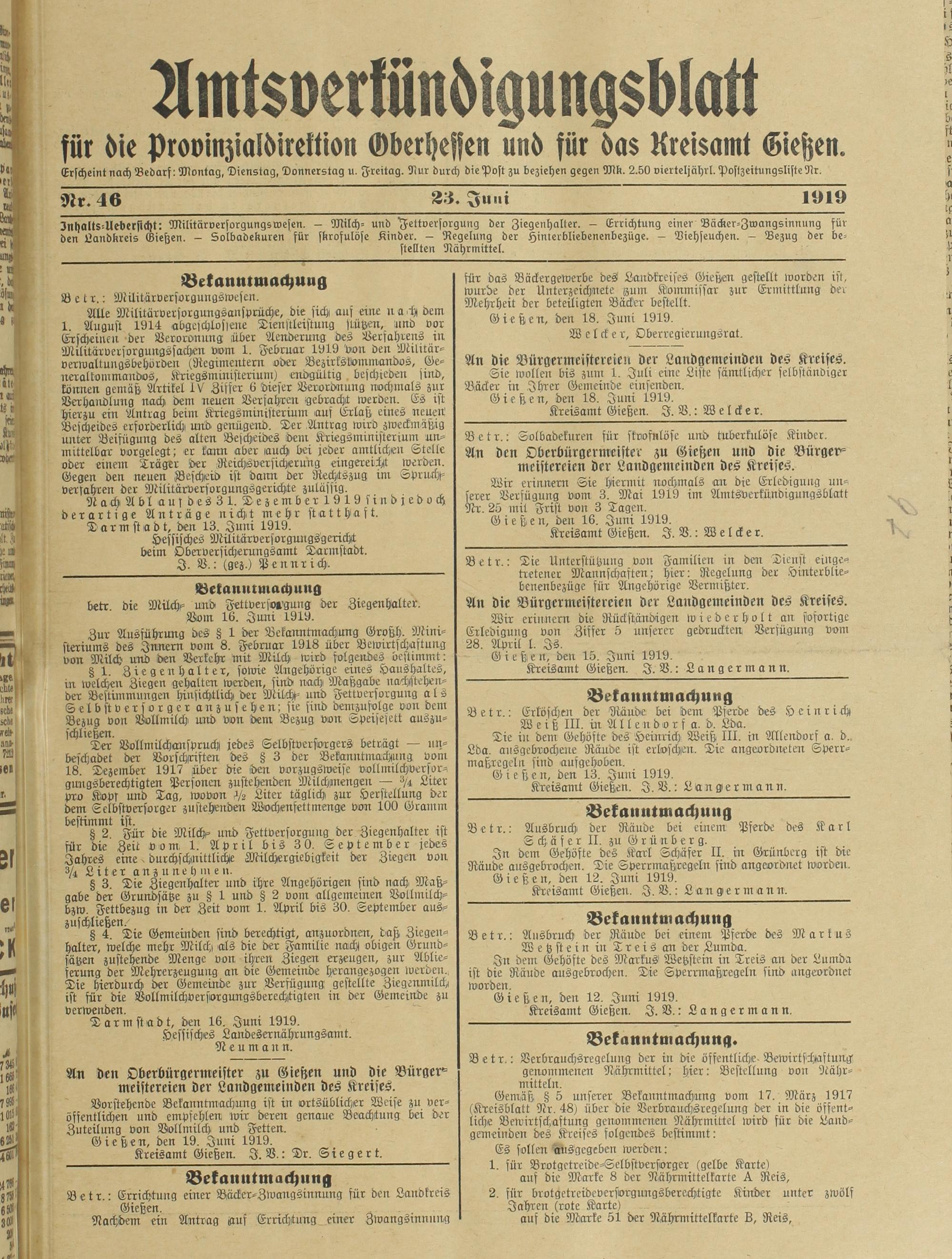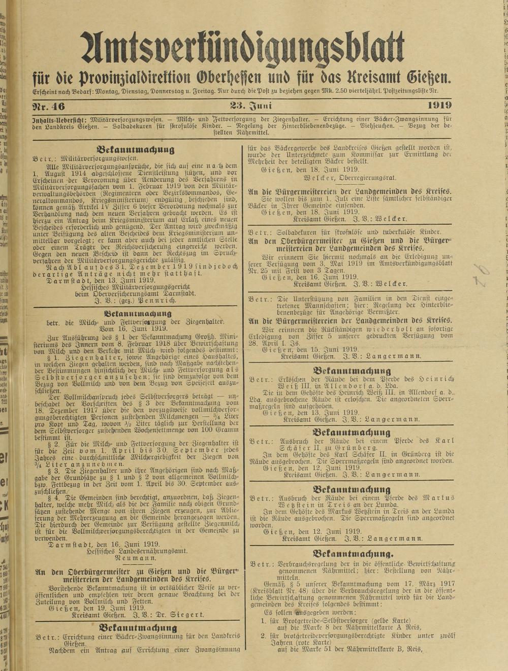 Amtsverkündigungsblatt für die Provinzialdirektion Oberhessen und der Kreisämter Gießen, Friedberg, Büdingen, Lauterbach, Schotten und Alsfeld. 1919-1937