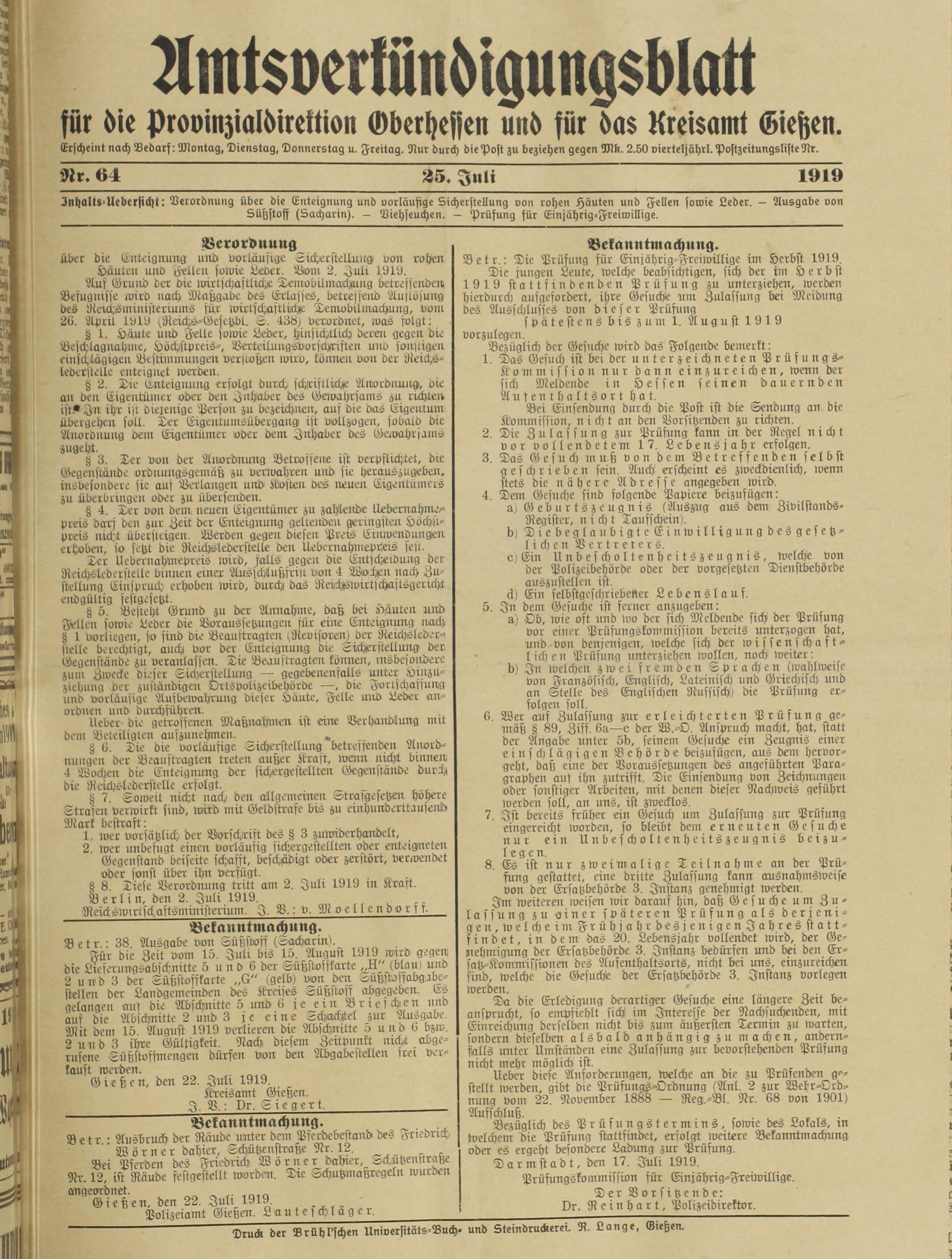 Amtsverkündigungsblatt für die Provinzialdirektion Oberhessen und der Kreisämter Gießen, Friedberg, Büdingen, Lauterbach, Schotten und Alsfeld. 1919-1937