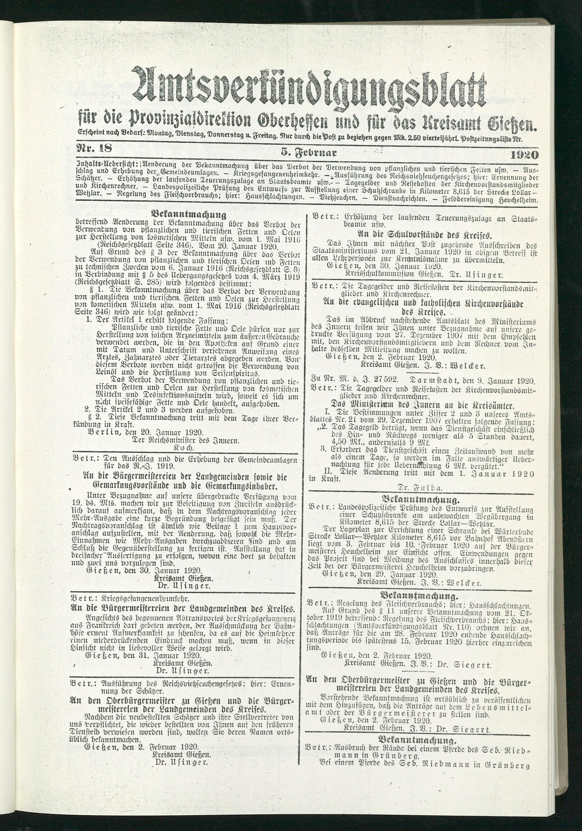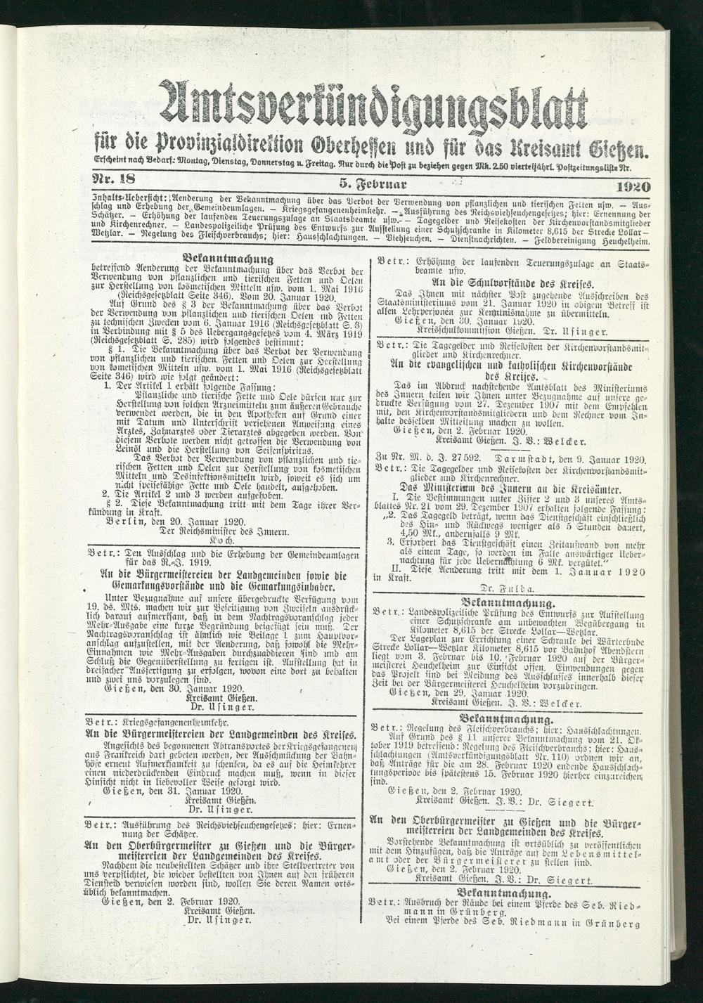 Amtsverkündigungsblatt für die Provinzialdirektion Oberhessen und der Kreisämter Gießen, Friedberg, Büdingen, Lauterbach, Schotten und Alsfeld. 1919-1937