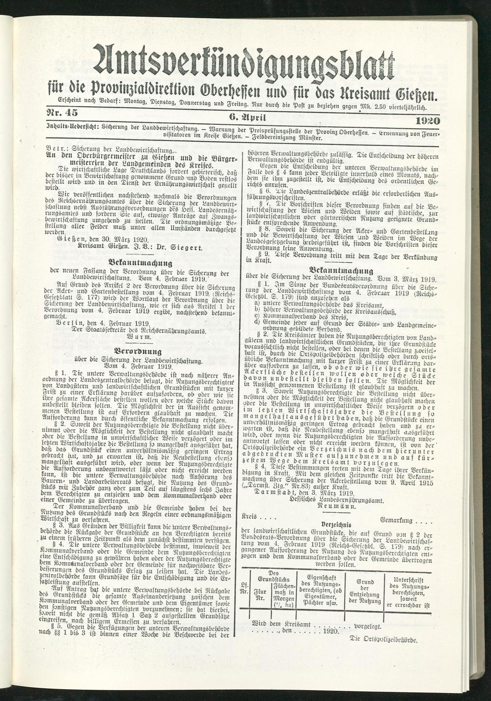 Amtsverkündigungsblatt für die Provinzialdirektion Oberhessen und der Kreisämter Gießen, Friedberg, Büdingen, Lauterbach, Schotten und Alsfeld. 1919-1937