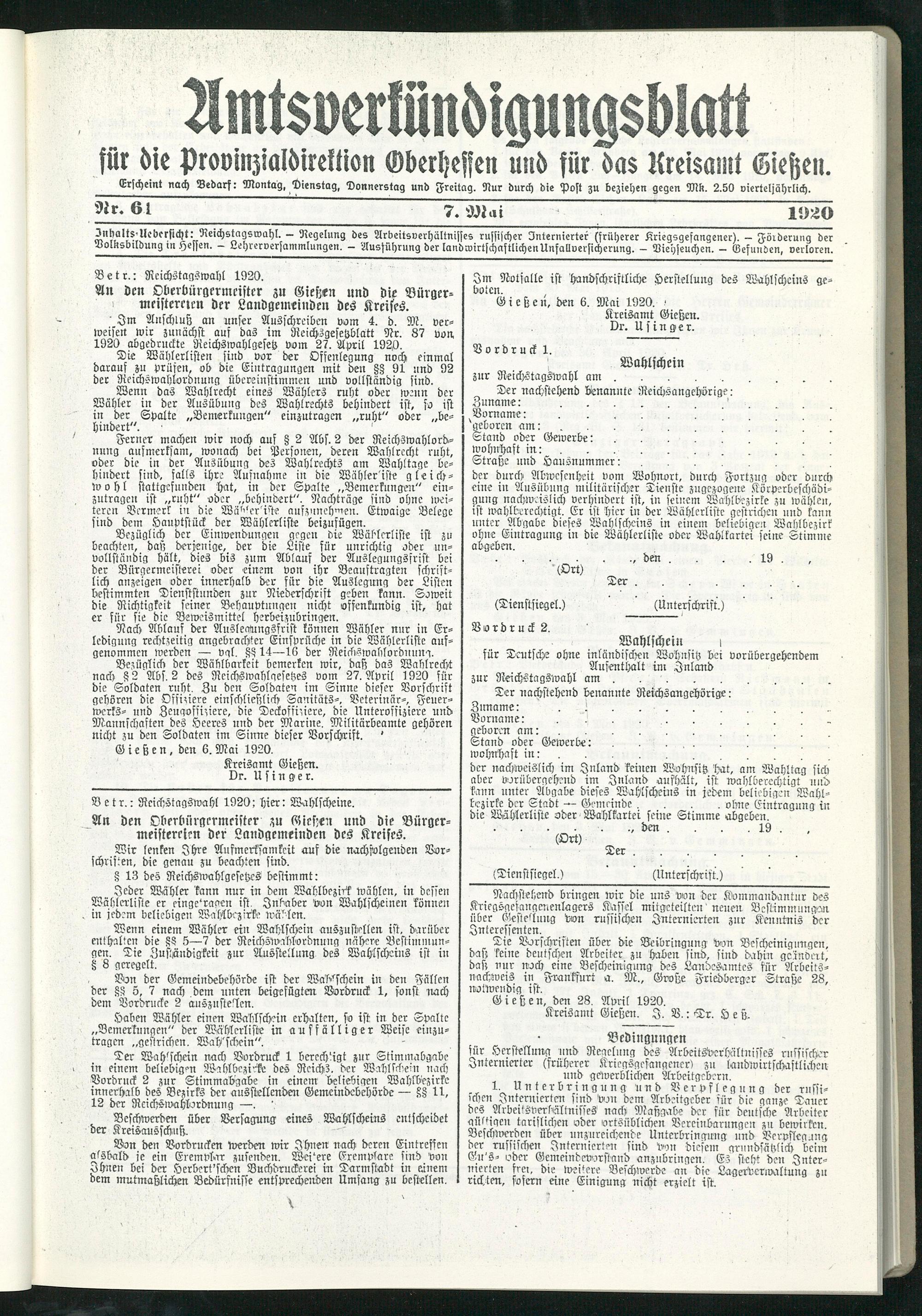 Amtsverkündigungsblatt für die Provinzialdirektion Oberhessen und der Kreisämter Gießen, Friedberg, Büdingen, Lauterbach, Schotten und Alsfeld. 1919-1937