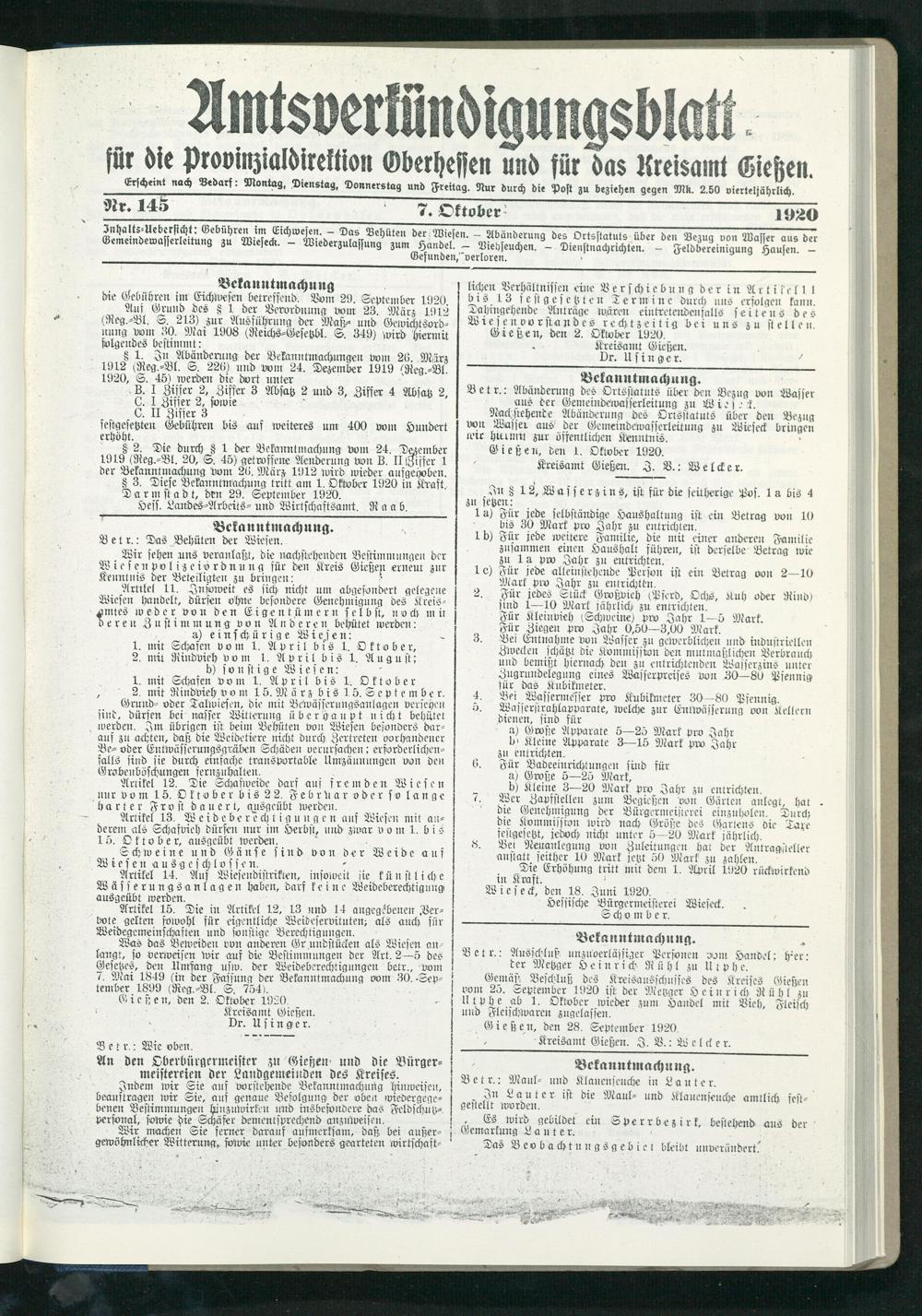 Amtsverkündigungsblatt für die Provinzialdirektion Oberhessen und der Kreisämter Gießen, Friedberg, Büdingen, Lauterbach, Schotten und Alsfeld. 1919-1937
