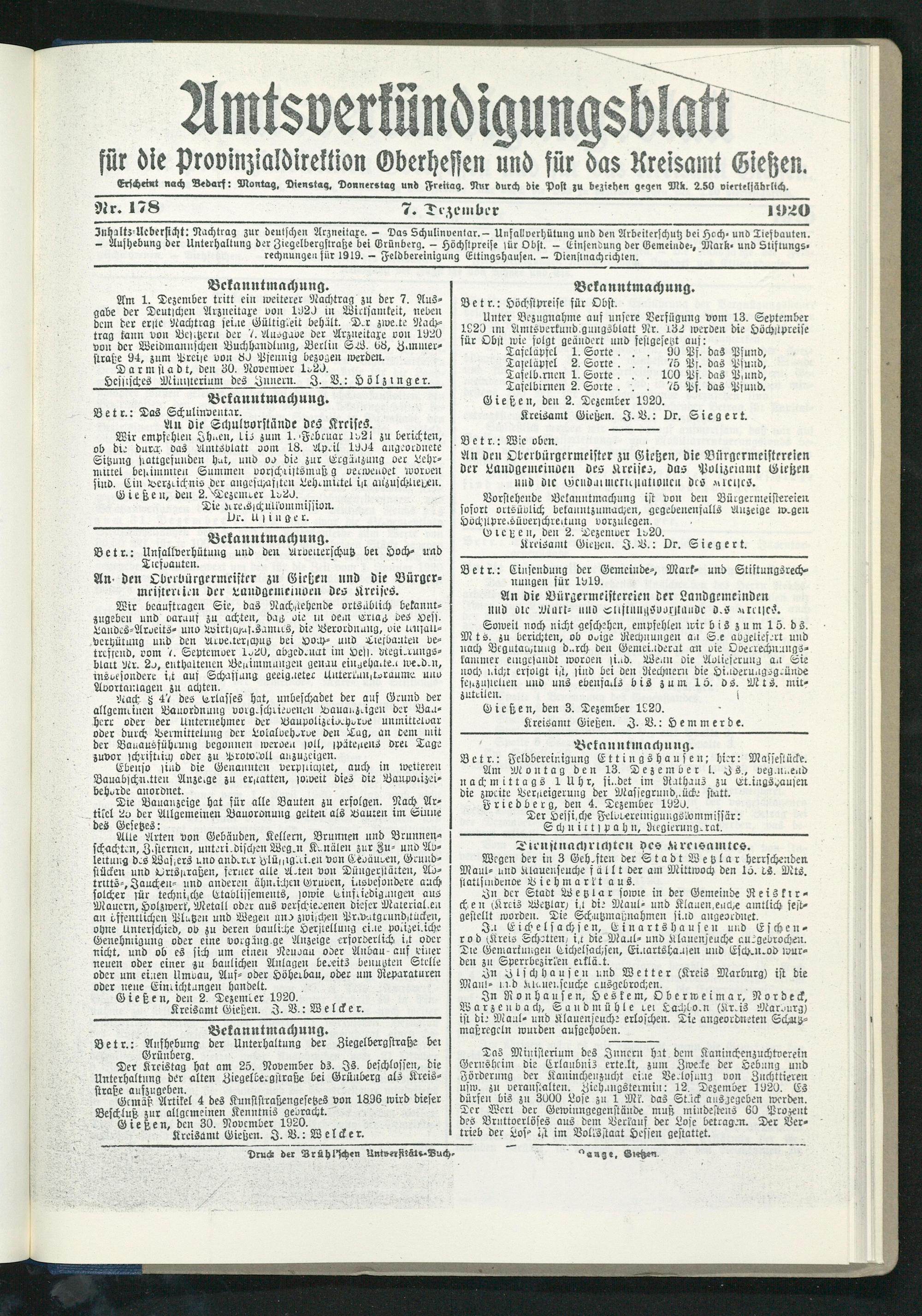 Amtsverkündigungsblatt für die Provinzialdirektion Oberhessen und der Kreisämter Gießen, Friedberg, Büdingen, Lauterbach, Schotten und Alsfeld. 1919-1937