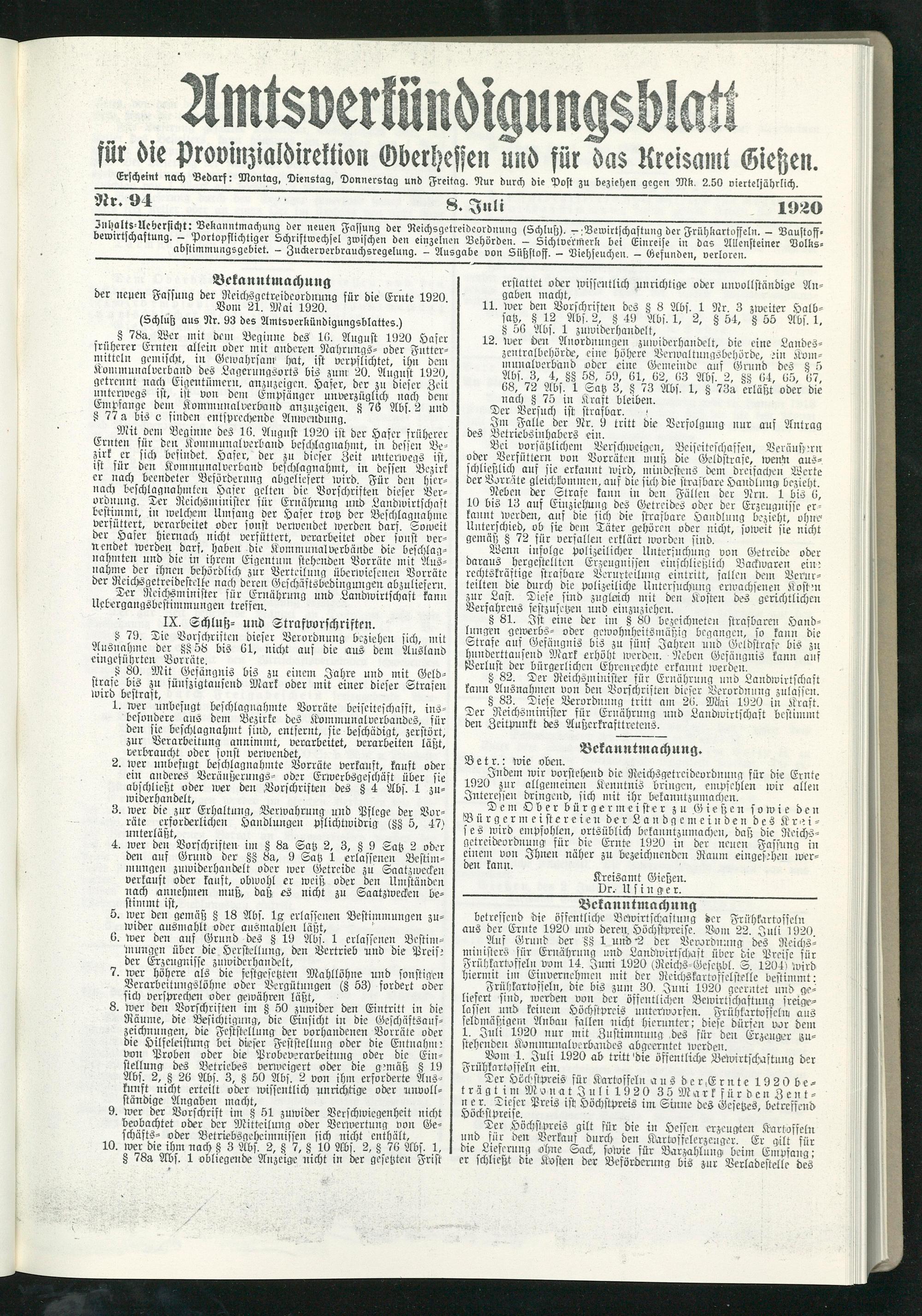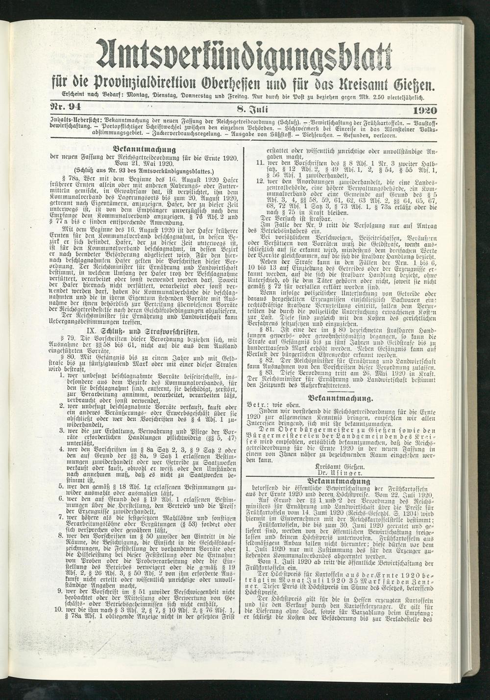 Amtsverkündigungsblatt für die Provinzialdirektion Oberhessen und der Kreisämter Gießen, Friedberg, Büdingen, Lauterbach, Schotten und Alsfeld. 1919-1937