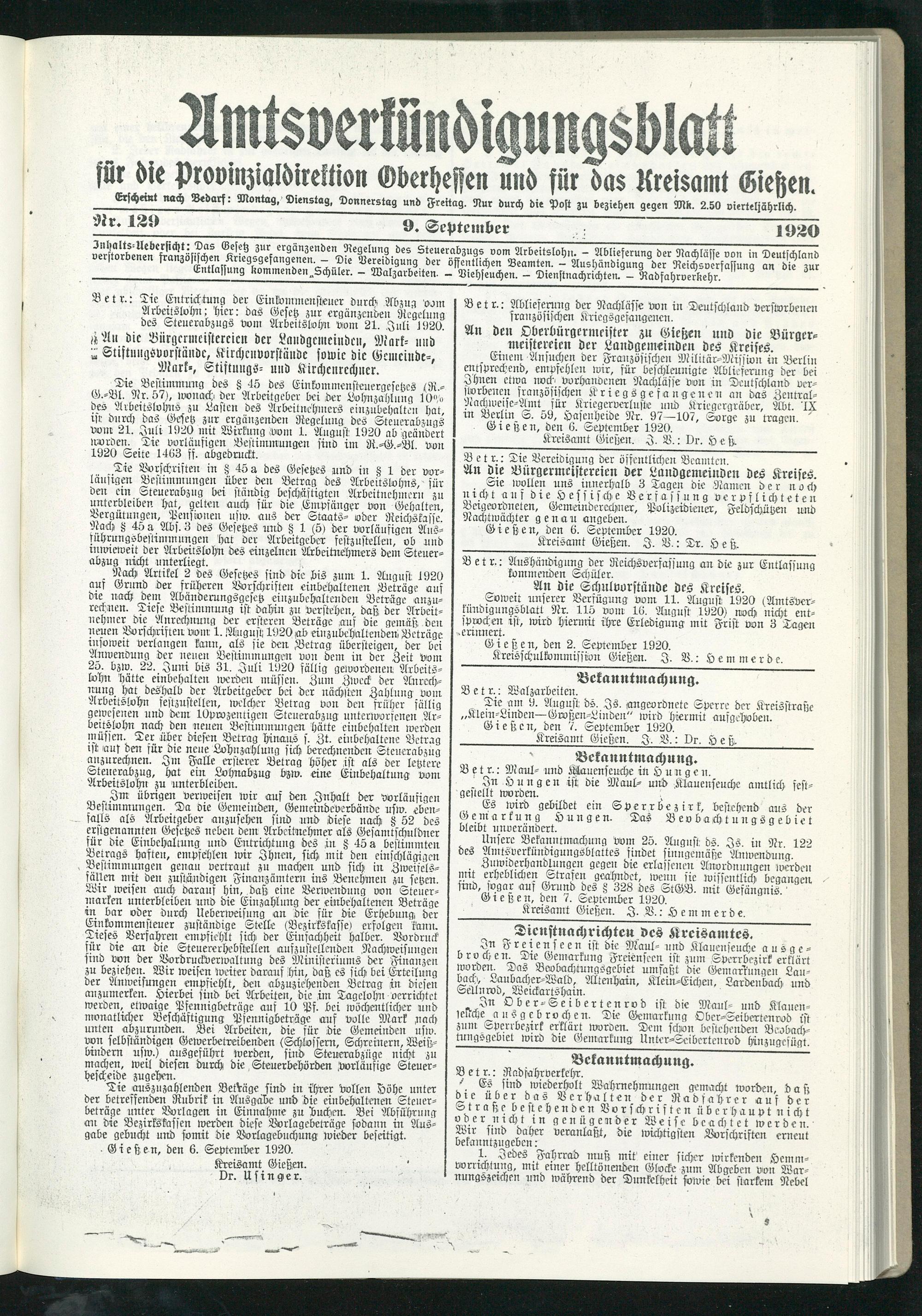 Amtsverkündigungsblatt für die Provinzialdirektion Oberhessen und der Kreisämter Gießen, Friedberg, Büdingen, Lauterbach, Schotten und Alsfeld. 1919-1937