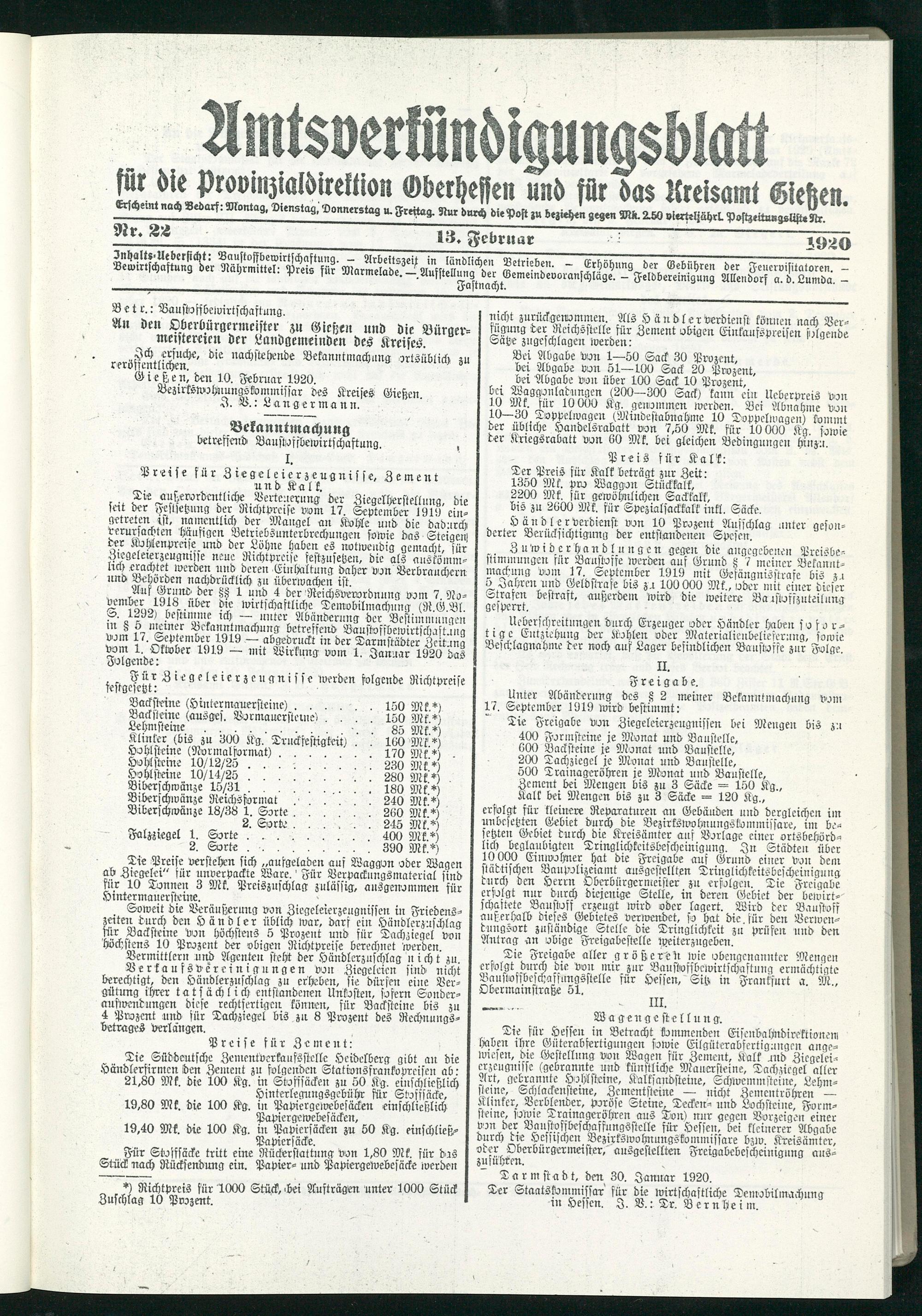 Amtsverkündigungsblatt für die Provinzialdirektion Oberhessen und der Kreisämter Gießen, Friedberg, Büdingen, Lauterbach, Schotten und Alsfeld. 1919-1937