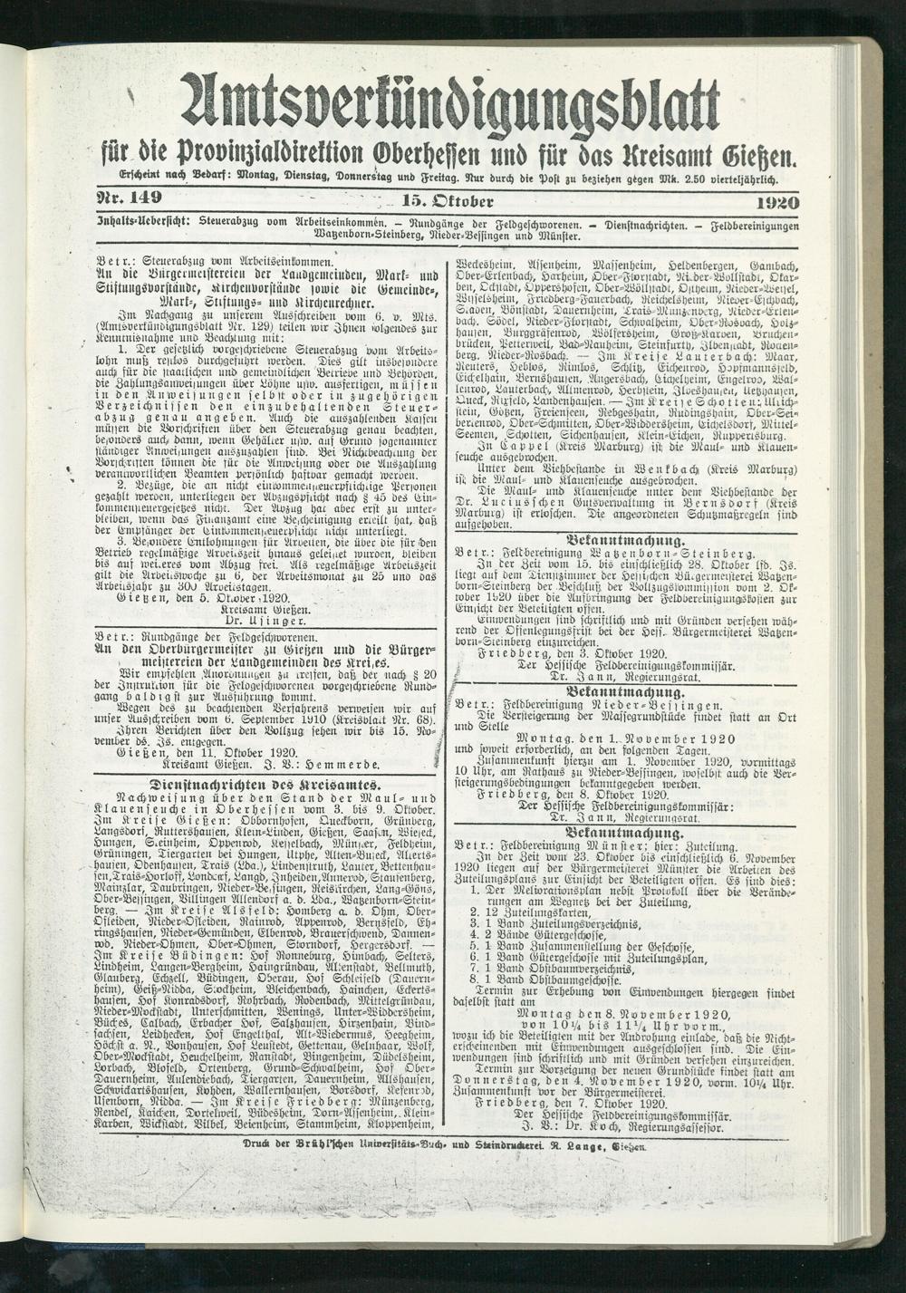 Amtsverkündigungsblatt für die Provinzialdirektion Oberhessen und der Kreisämter Gießen, Friedberg, Büdingen, Lauterbach, Schotten und Alsfeld. 1919-1937