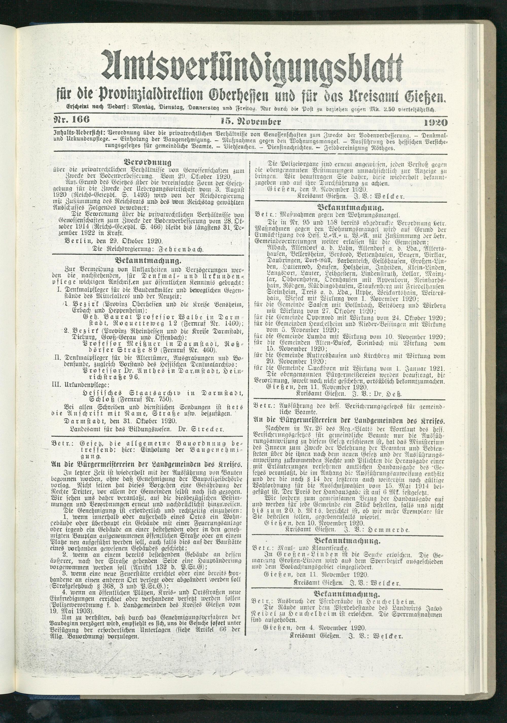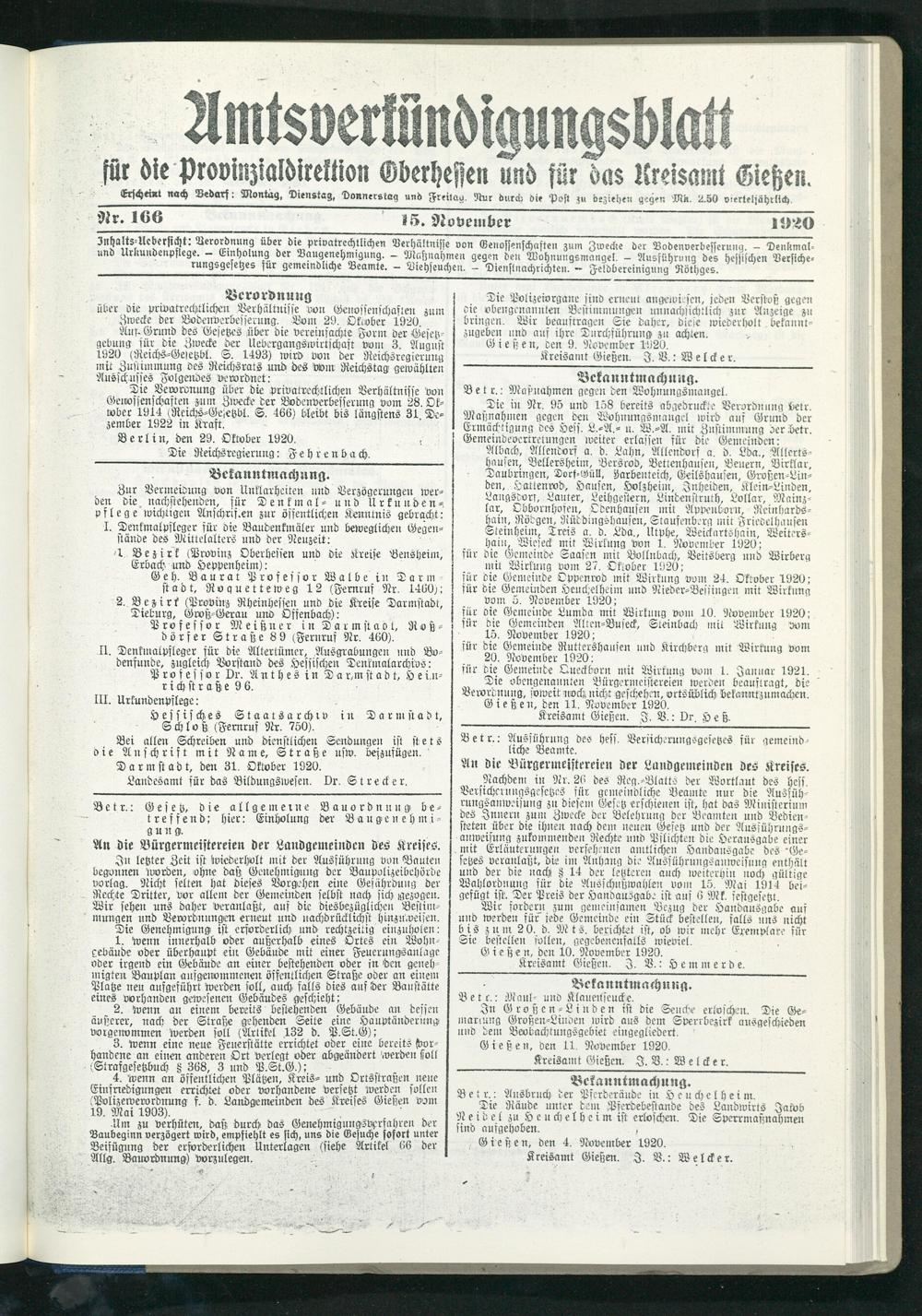 Amtsverkündigungsblatt für die Provinzialdirektion Oberhessen und der Kreisämter Gießen, Friedberg, Büdingen, Lauterbach, Schotten und Alsfeld. 1919-1937