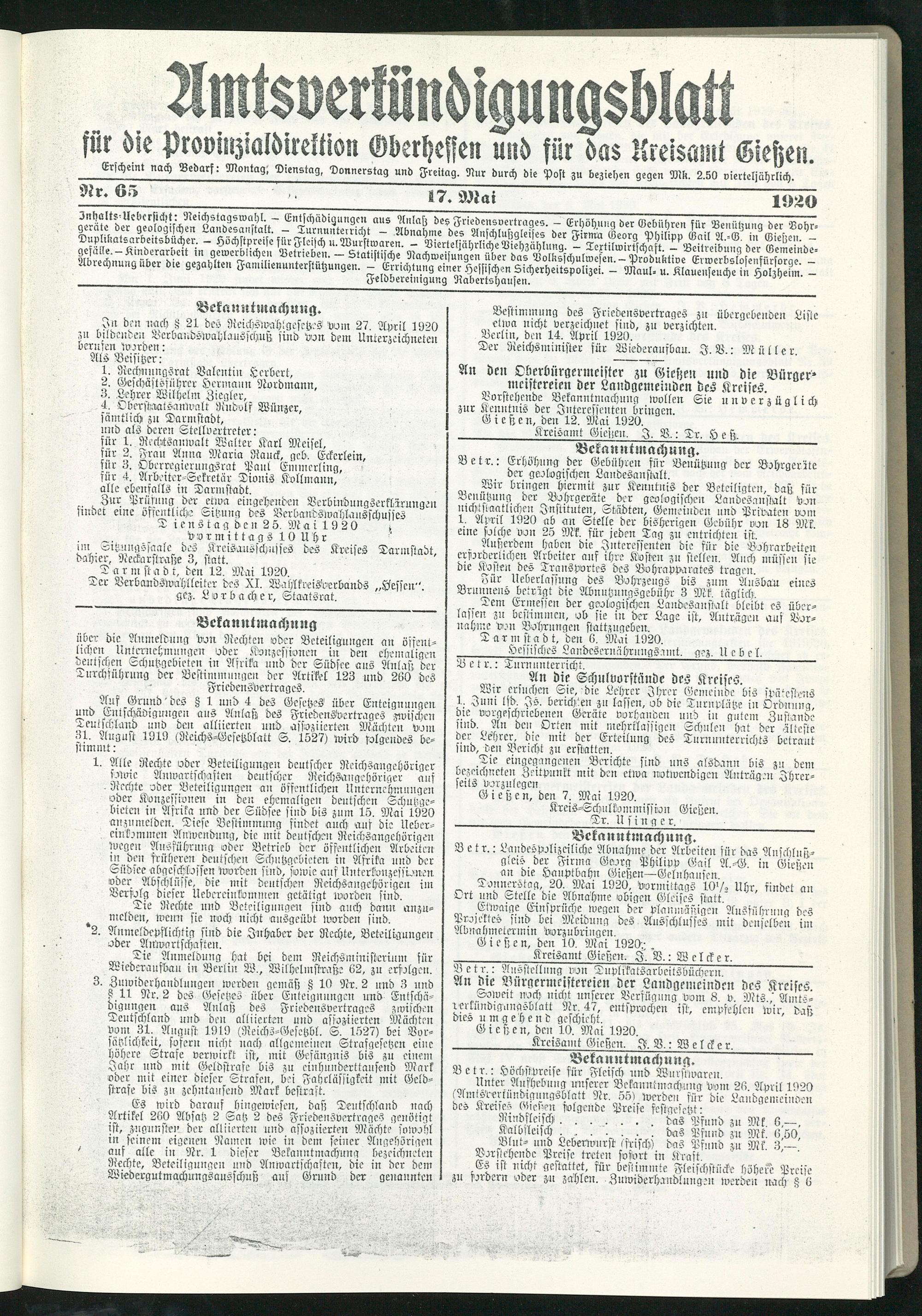 Amtsverkündigungsblatt für die Provinzialdirektion Oberhessen und der Kreisämter Gießen, Friedberg, Büdingen, Lauterbach, Schotten und Alsfeld. 1919-1937