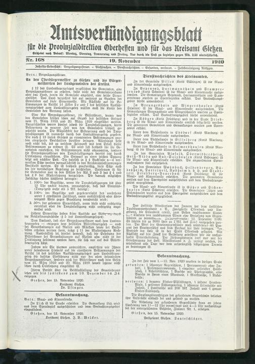 Amtsverkündigungsblatt für die Provinzialdirektion Oberhessen und der Kreisämter Gießen, Friedberg, Büdingen, Lauterbach, Schotten und Alsfeld. 1919-1937