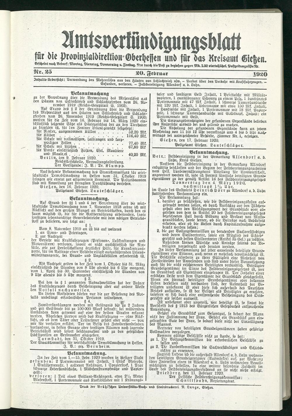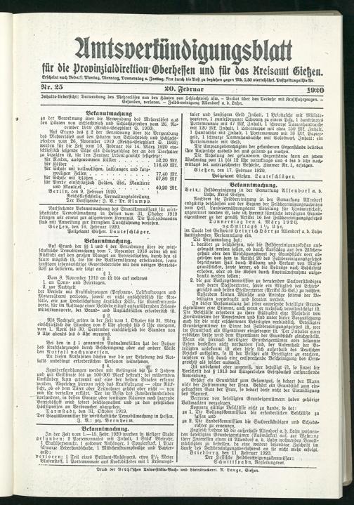 Amtsverkündigungsblatt für die Provinzialdirektion Oberhessen und der Kreisämter Gießen, Friedberg, Büdingen, Lauterbach, Schotten und Alsfeld. 1919-1937