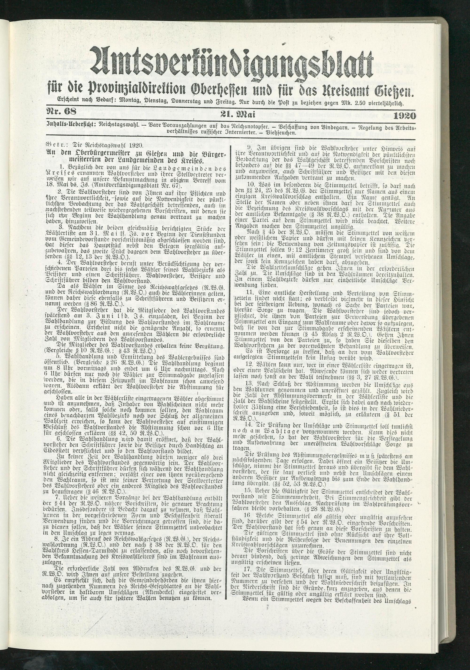 Amtsverkündigungsblatt für die Provinzialdirektion Oberhessen und der Kreisämter Gießen, Friedberg, Büdingen, Lauterbach, Schotten und Alsfeld. 1919-1937