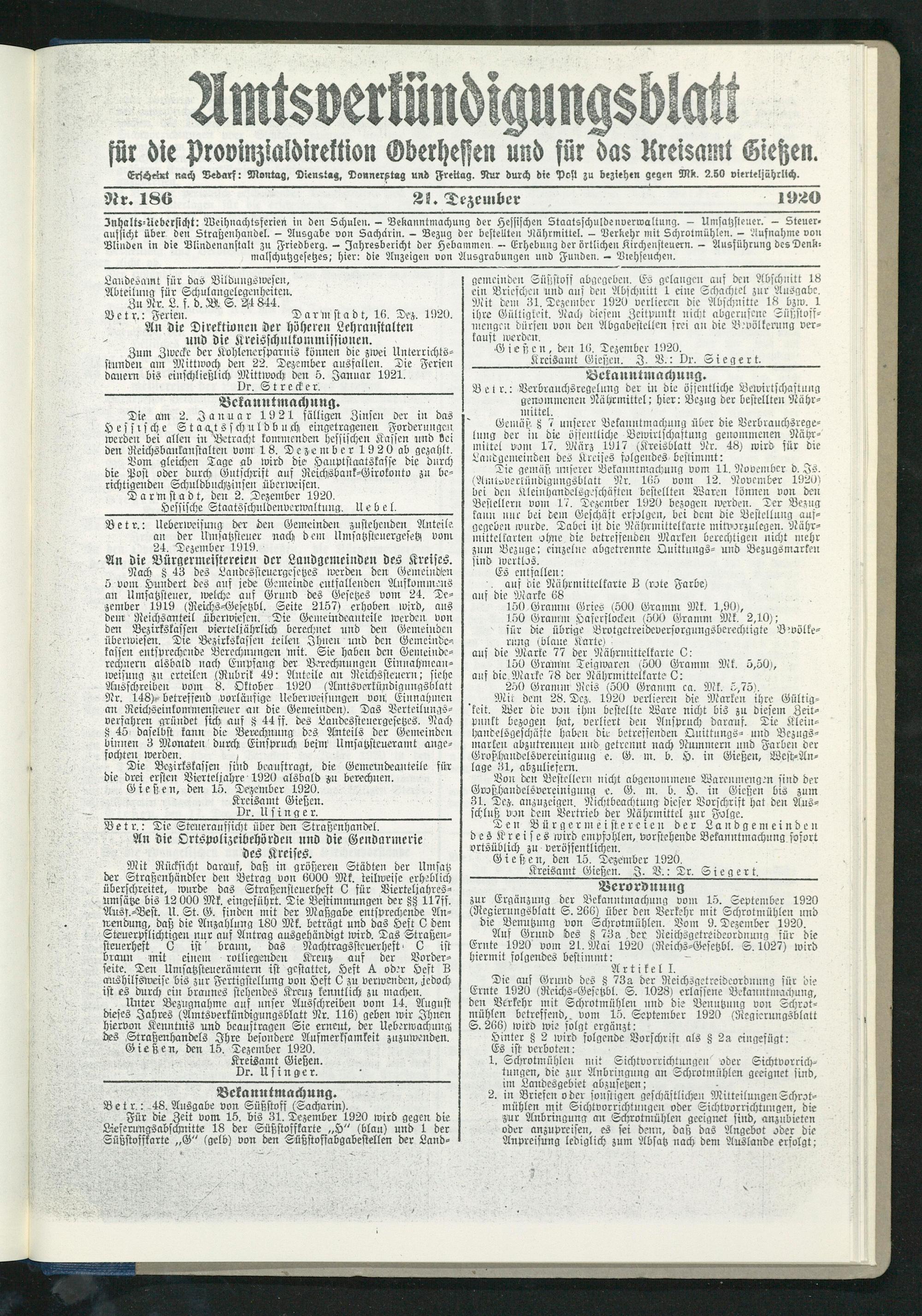 Amtsverkündigungsblatt für die Provinzialdirektion Oberhessen und der Kreisämter Gießen, Friedberg, Büdingen, Lauterbach, Schotten und Alsfeld. 1919-1937