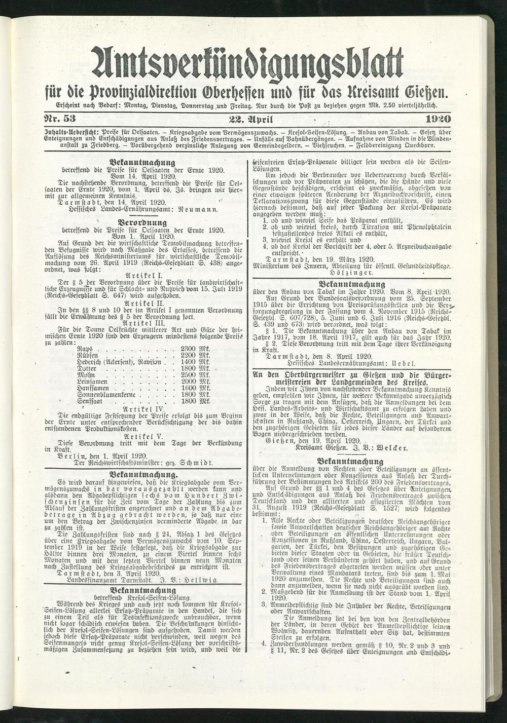 Amtsverkündigungsblatt für die Provinzialdirektion Oberhessen und der Kreisämter Gießen, Friedberg, Büdingen, Lauterbach, Schotten und Alsfeld. 1919-1937
