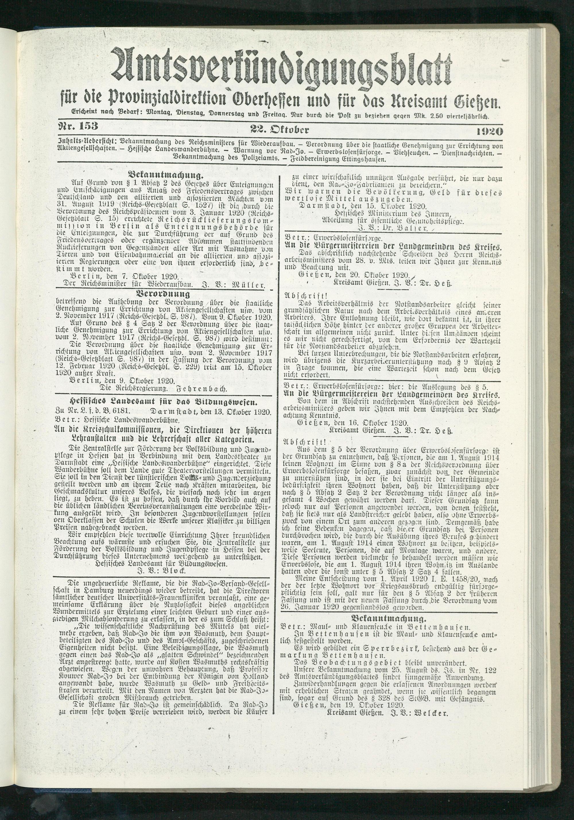Amtsverkündigungsblatt für die Provinzialdirektion Oberhessen und der Kreisämter Gießen, Friedberg, Büdingen, Lauterbach, Schotten und Alsfeld. 1919-1937