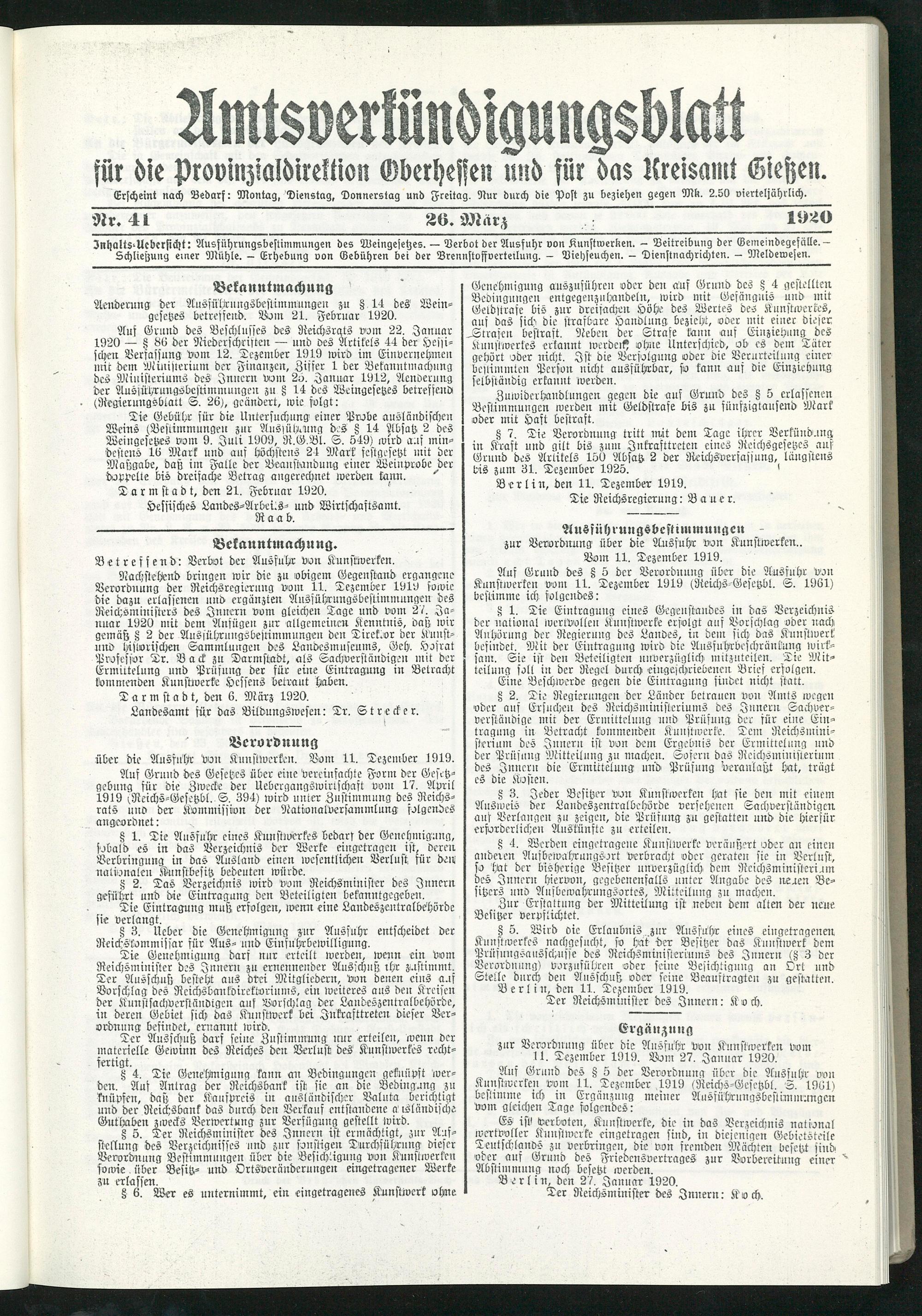 Amtsverkündigungsblatt für die Provinzialdirektion Oberhessen und der Kreisämter Gießen, Friedberg, Büdingen, Lauterbach, Schotten und Alsfeld. 1919-1937