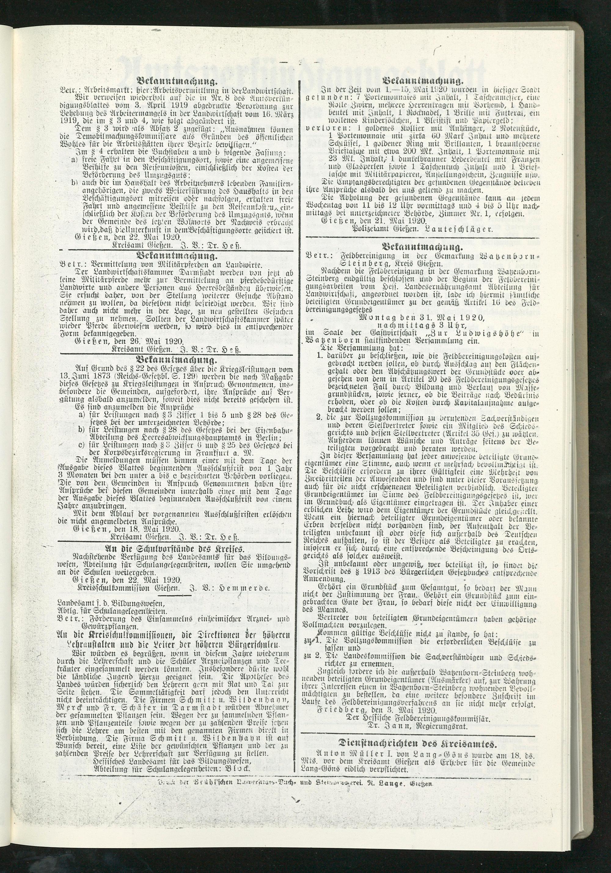 Amtsverkündigungsblatt für die Provinzialdirektion Oberhessen und der Kreisämter Gießen, Friedberg, Büdingen, Lauterbach, Schotten und Alsfeld. 1919-1937
