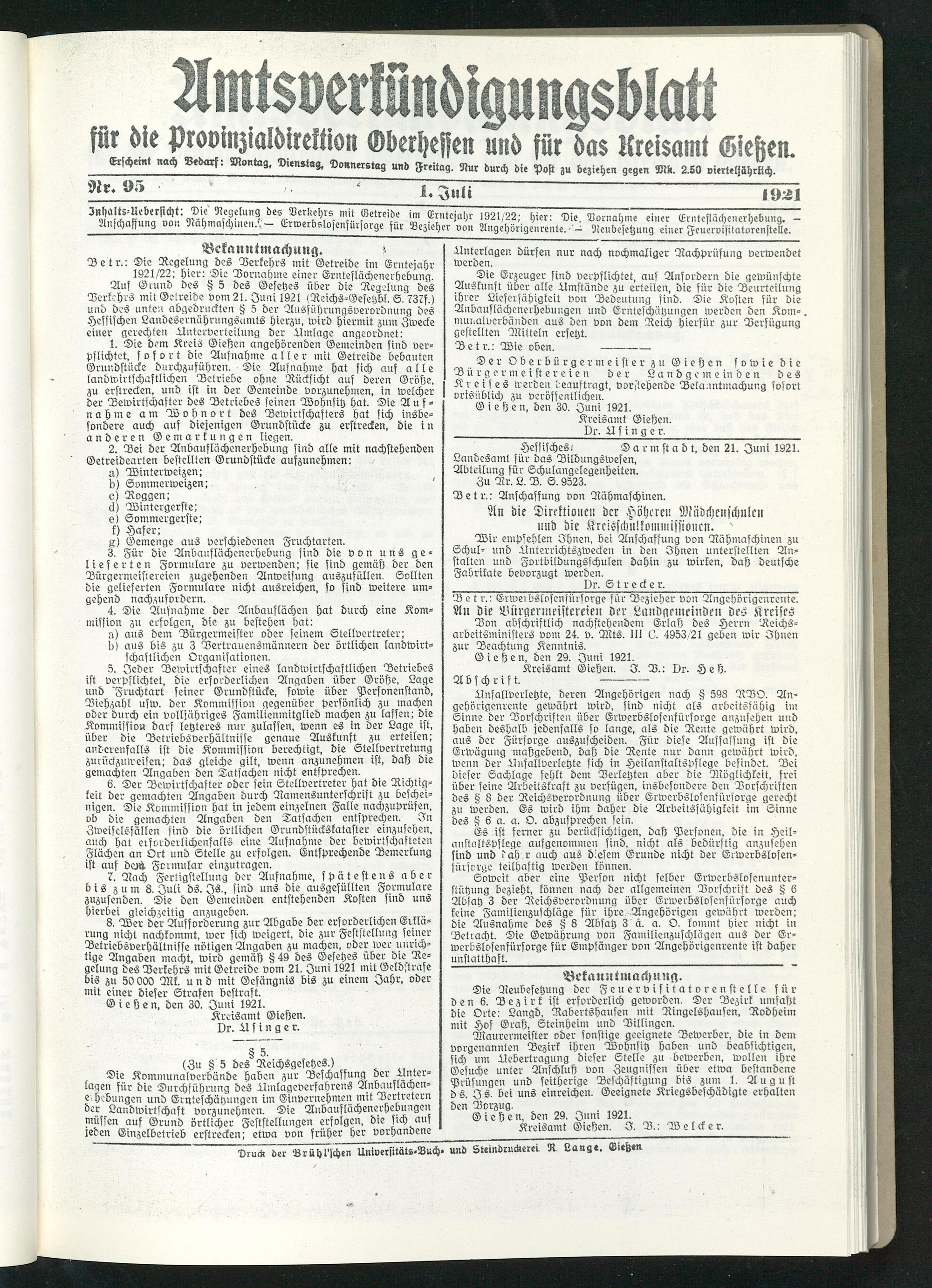 Amtsverkündigungsblatt für die Provinzialdirektion Oberhessen und der Kreisämter Gießen, Friedberg, Büdingen, Lauterbach, Schotten und Alsfeld. 1919-1937