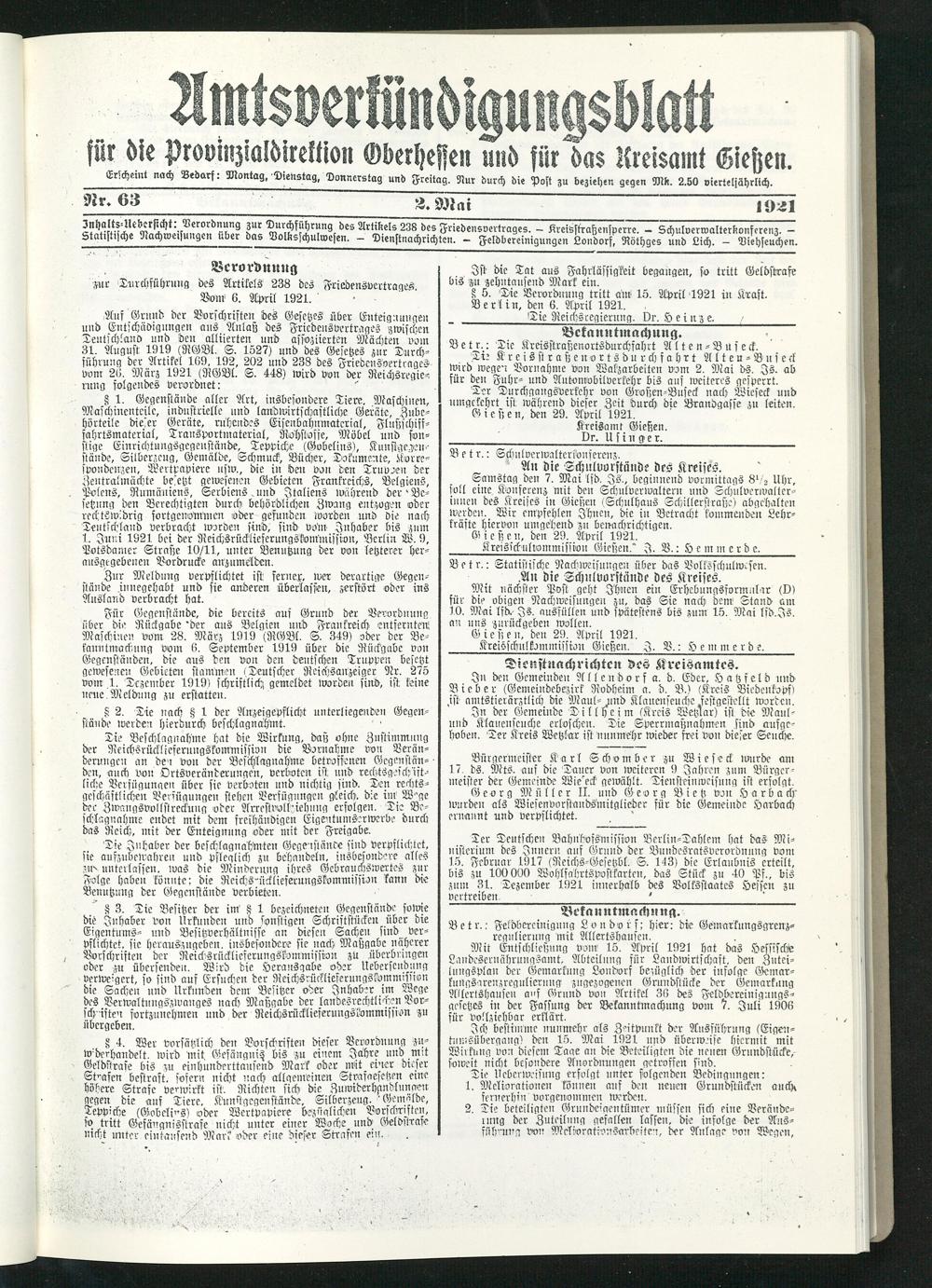 Amtsverkündigungsblatt für die Provinzialdirektion Oberhessen und der Kreisämter Gießen, Friedberg, Büdingen, Lauterbach, Schotten und Alsfeld. 1919-1937