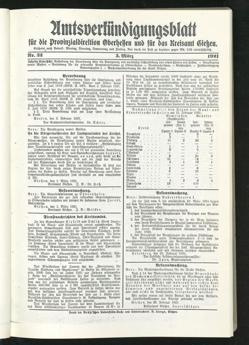 Amtsverkündigungsblatt für die Provinzialdirektion Oberhessen und der Kreisämter Gießen, Friedberg, Büdingen, Lauterbach, Schotten und Alsfeld. 1919-1937