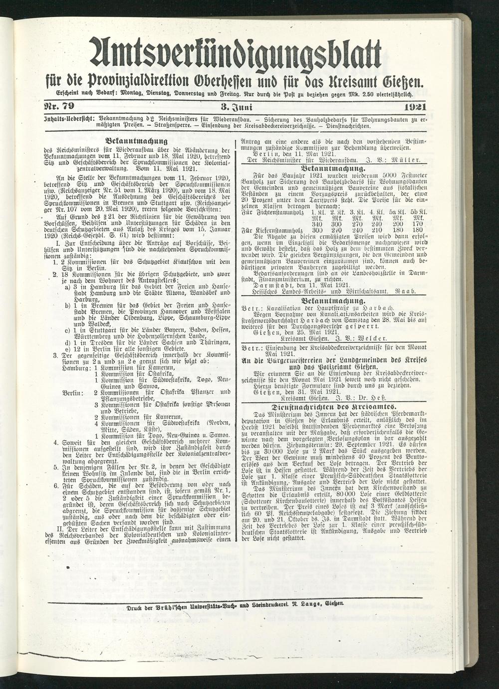 Amtsverkündigungsblatt für die Provinzialdirektion Oberhessen und der Kreisämter Gießen, Friedberg, Büdingen, Lauterbach, Schotten und Alsfeld. 1919-1937