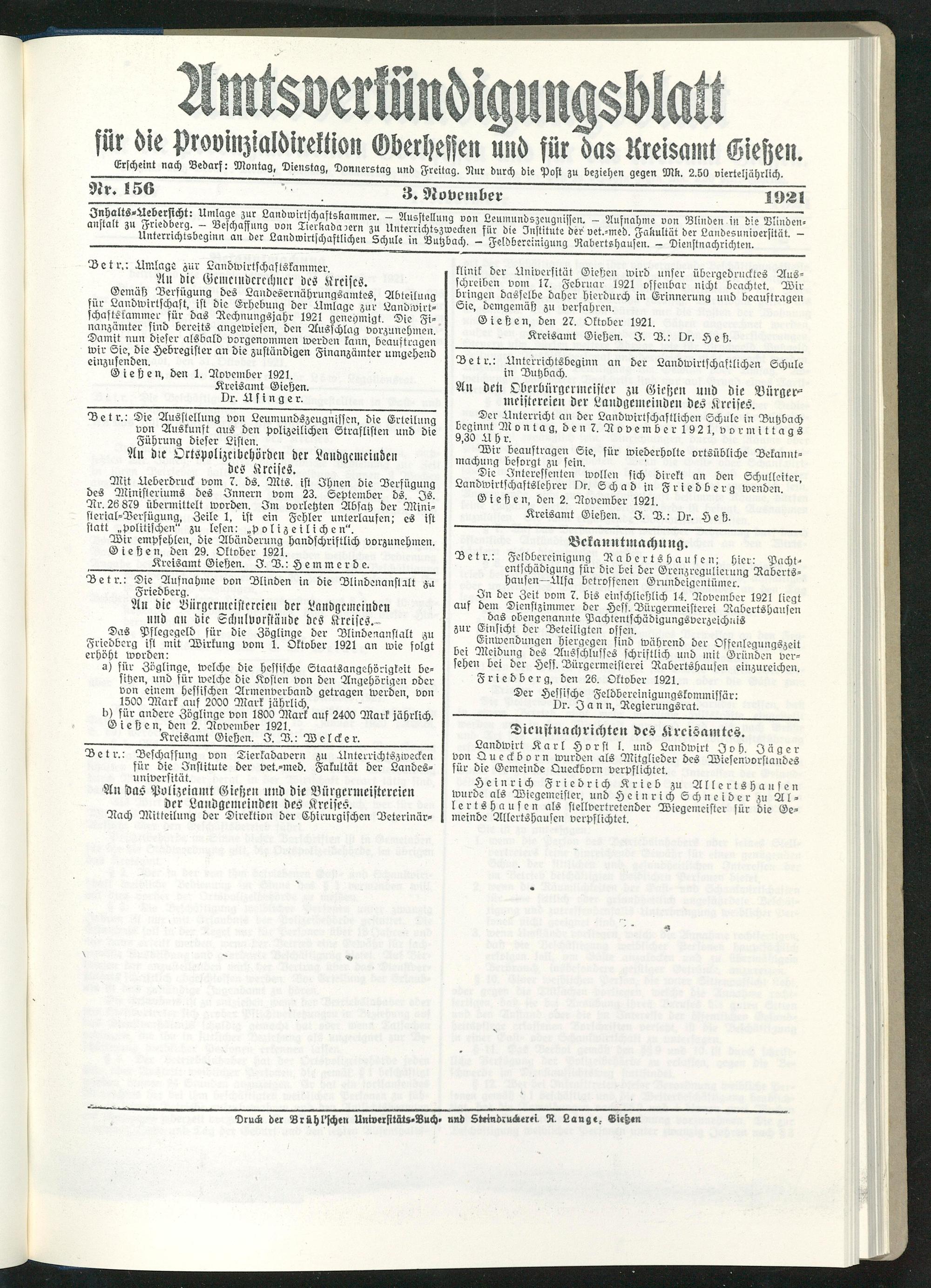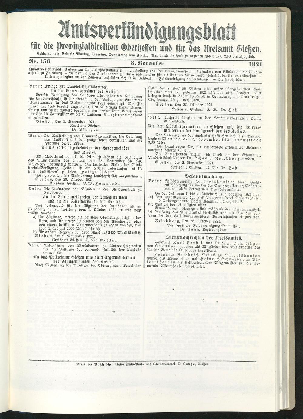 Amtsverkündigungsblatt für die Provinzialdirektion Oberhessen und der Kreisämter Gießen, Friedberg, Büdingen, Lauterbach, Schotten und Alsfeld. 1919-1937