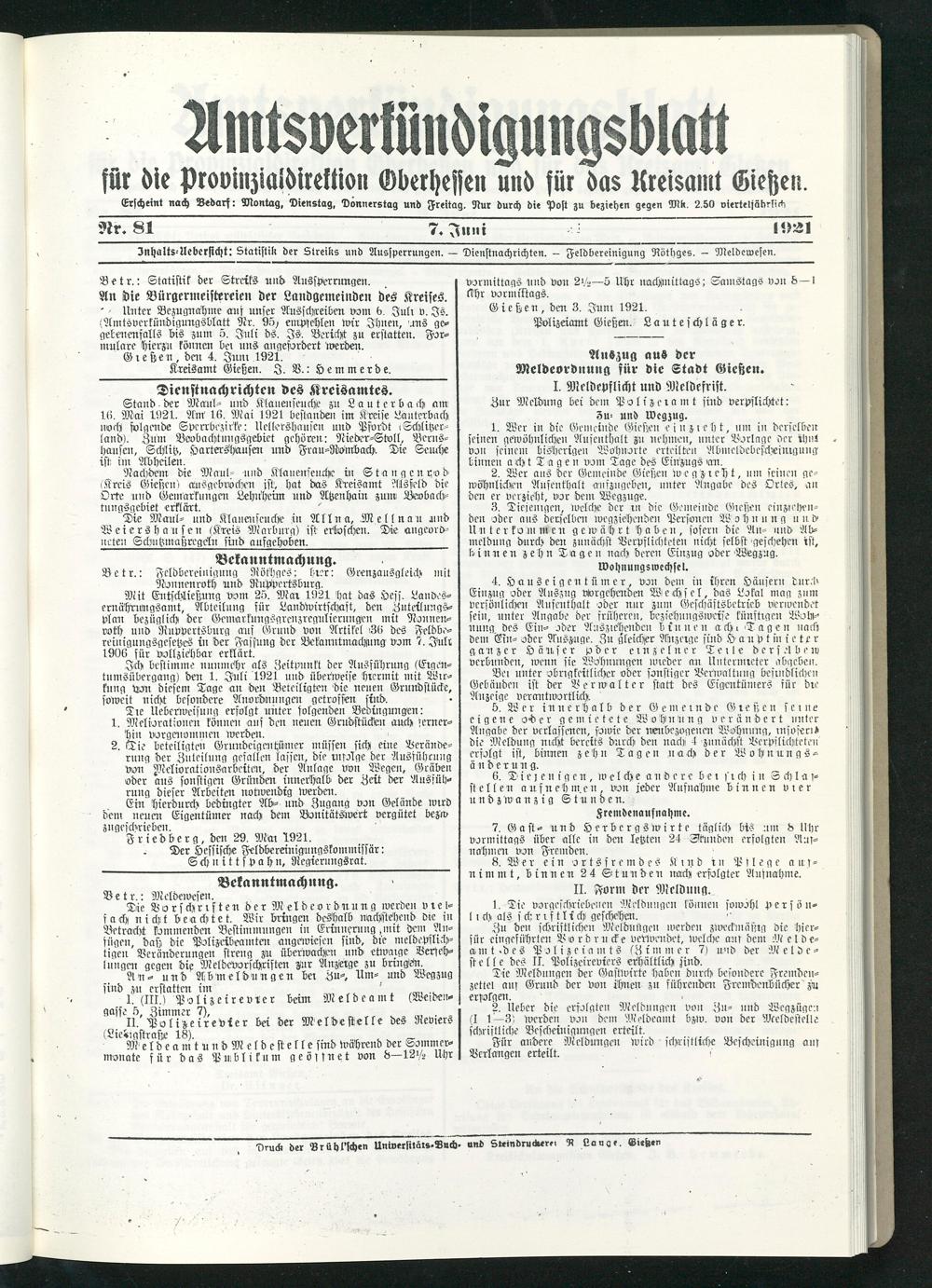 Amtsverkündigungsblatt für die Provinzialdirektion Oberhessen und der Kreisämter Gießen, Friedberg, Büdingen, Lauterbach, Schotten und Alsfeld. 1919-1937