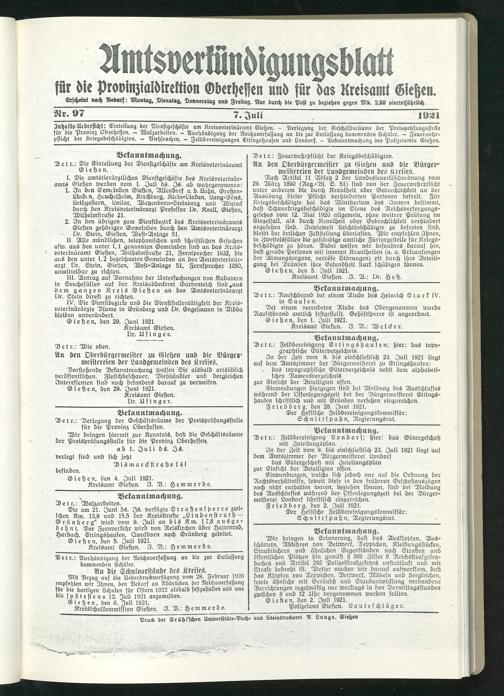 Amtsverkündigungsblatt für die Provinzialdirektion Oberhessen und der Kreisämter Gießen, Friedberg, Büdingen, Lauterbach, Schotten und Alsfeld. 1919-1937
