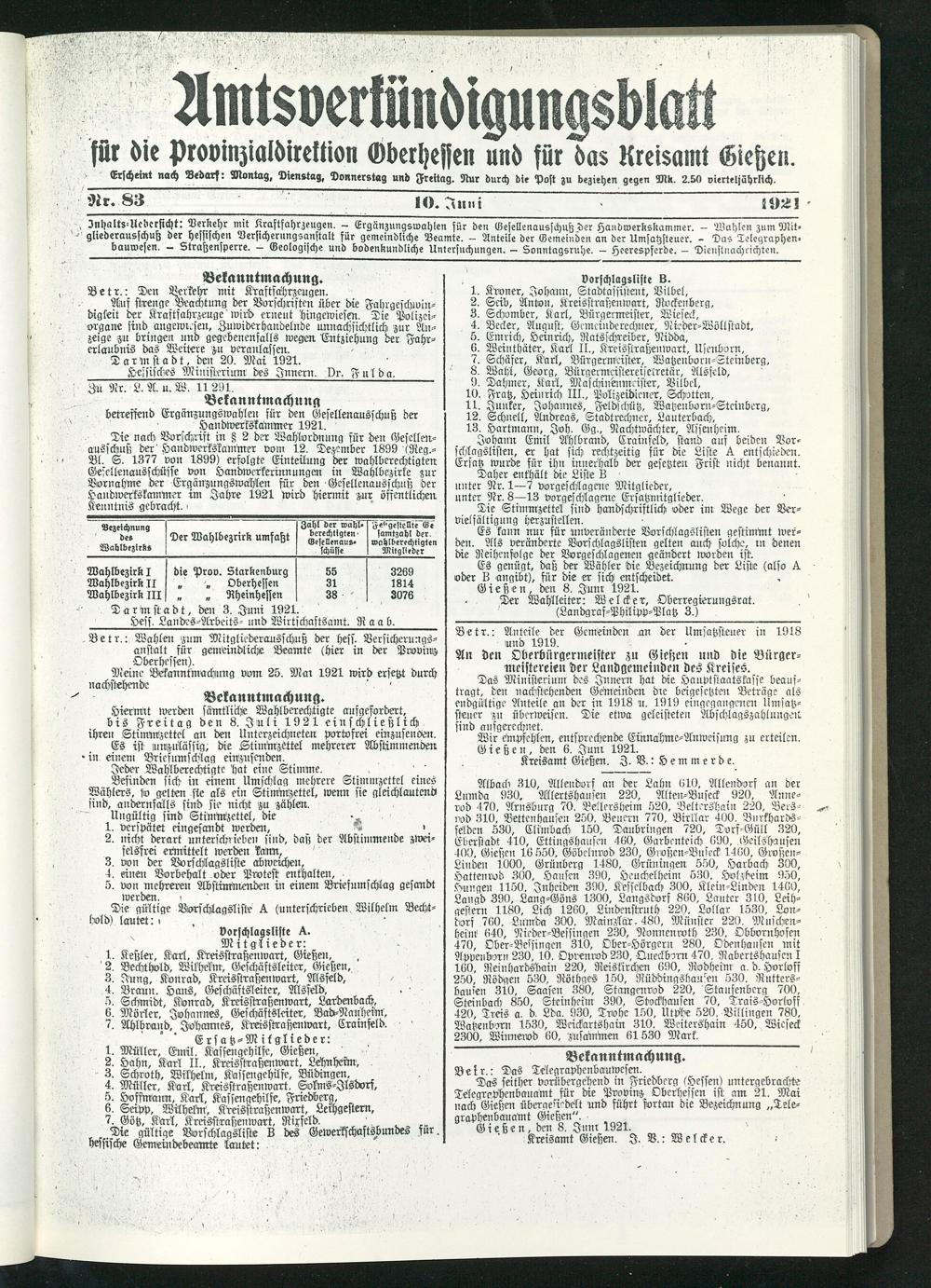 Amtsverkündigungsblatt für die Provinzialdirektion Oberhessen und der Kreisämter Gießen, Friedberg, Büdingen, Lauterbach, Schotten und Alsfeld. 1919-1937