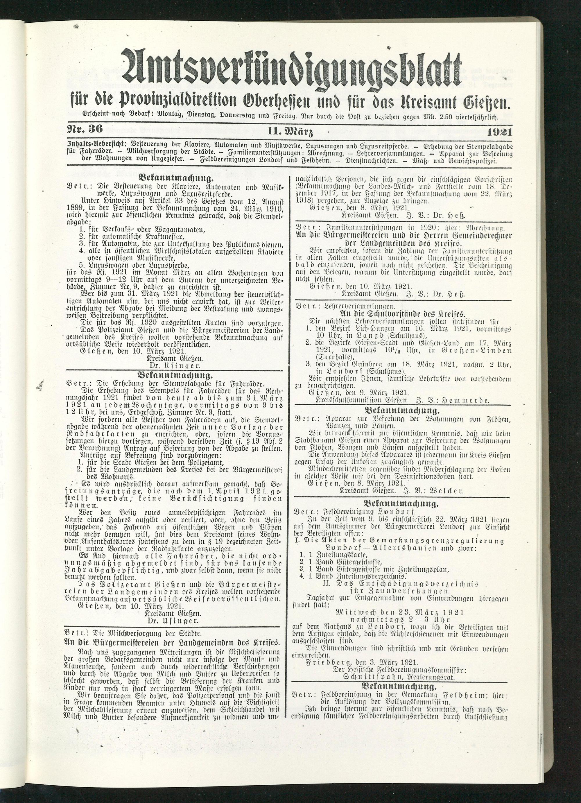 Amtsverkündigungsblatt für die Provinzialdirektion Oberhessen und der Kreisämter Gießen, Friedberg, Büdingen, Lauterbach, Schotten und Alsfeld. 1919-1937