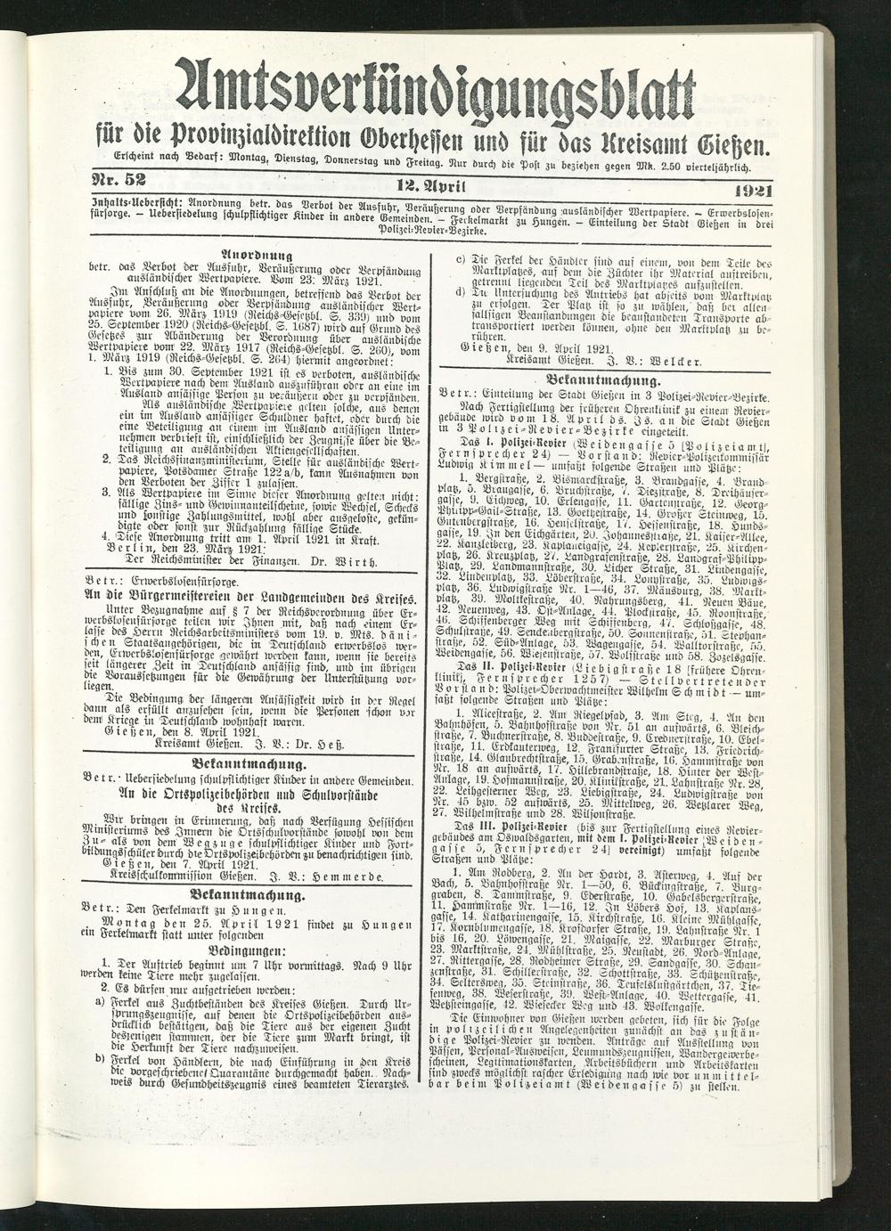 Amtsverkündigungsblatt für die Provinzialdirektion Oberhessen und der Kreisämter Gießen, Friedberg, Büdingen, Lauterbach, Schotten und Alsfeld. 1919-1937
