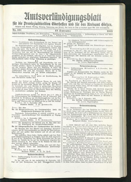 Amtsverkündigungsblatt für die Provinzialdirektion Oberhessen und der Kreisämter Gießen, Friedberg, Büdingen, Lauterbach, Schotten und Alsfeld. 1919-1937
