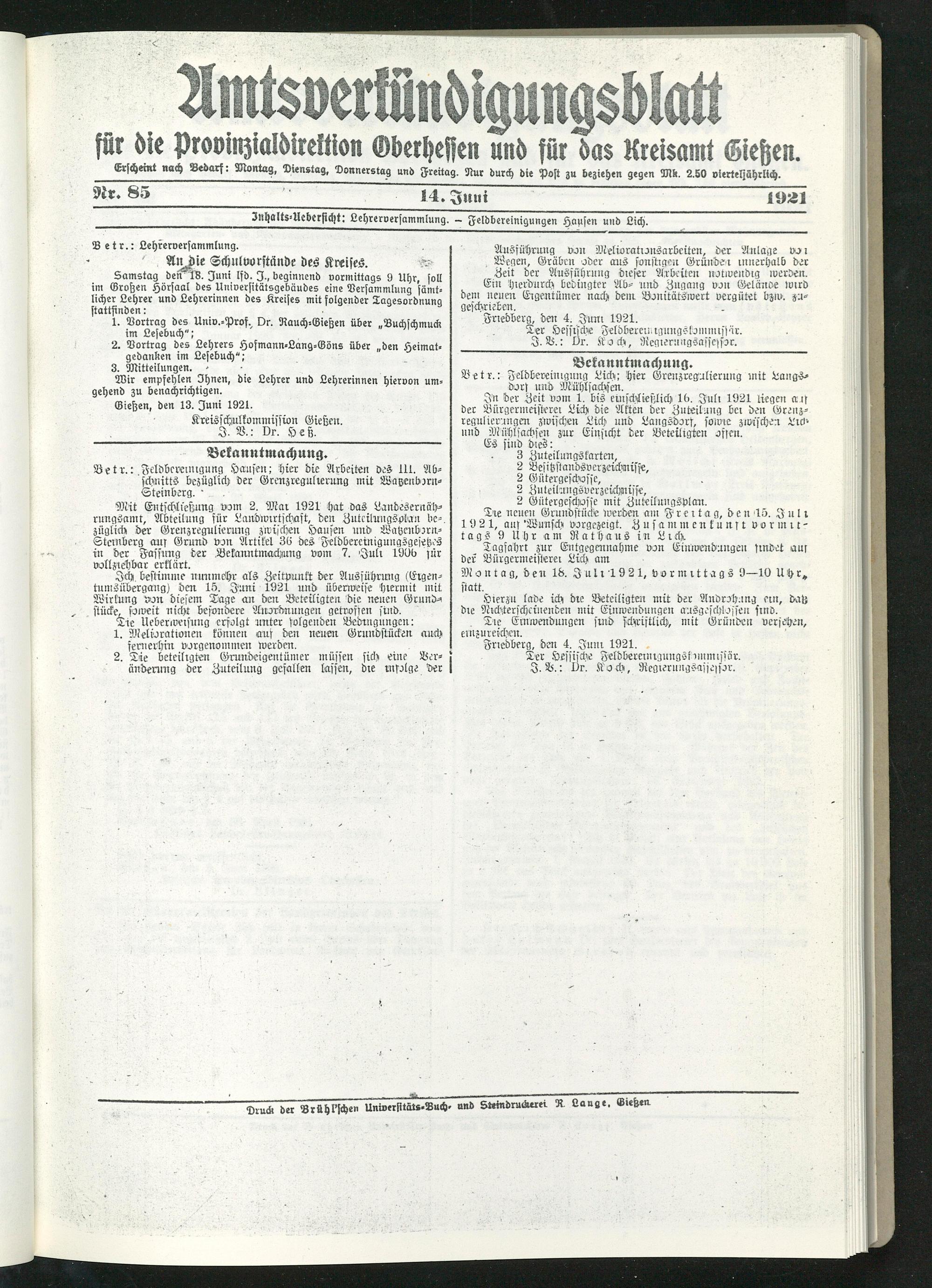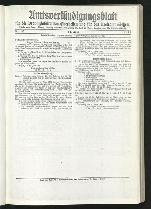 Amtsverkündigungsblatt für die Provinzialdirektion Oberhessen und der Kreisämter Gießen, Friedberg, Büdingen, Lauterbach, Schotten und Alsfeld. 1919-1937