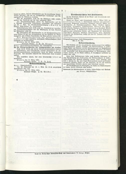 Amtsverkündigungsblatt für die Provinzialdirektion Oberhessen und der Kreisämter Gießen, Friedberg, Büdingen, Lauterbach, Schotten und Alsfeld. 1919-1937