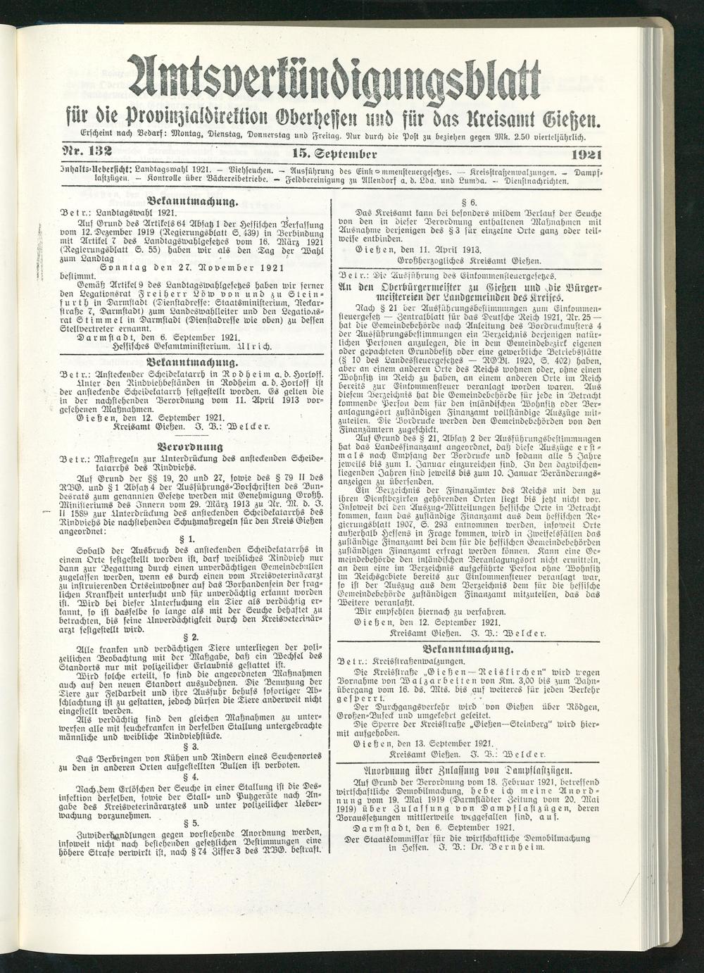 Amtsverkündigungsblatt für die Provinzialdirektion Oberhessen und der Kreisämter Gießen, Friedberg, Büdingen, Lauterbach, Schotten und Alsfeld. 1919-1937