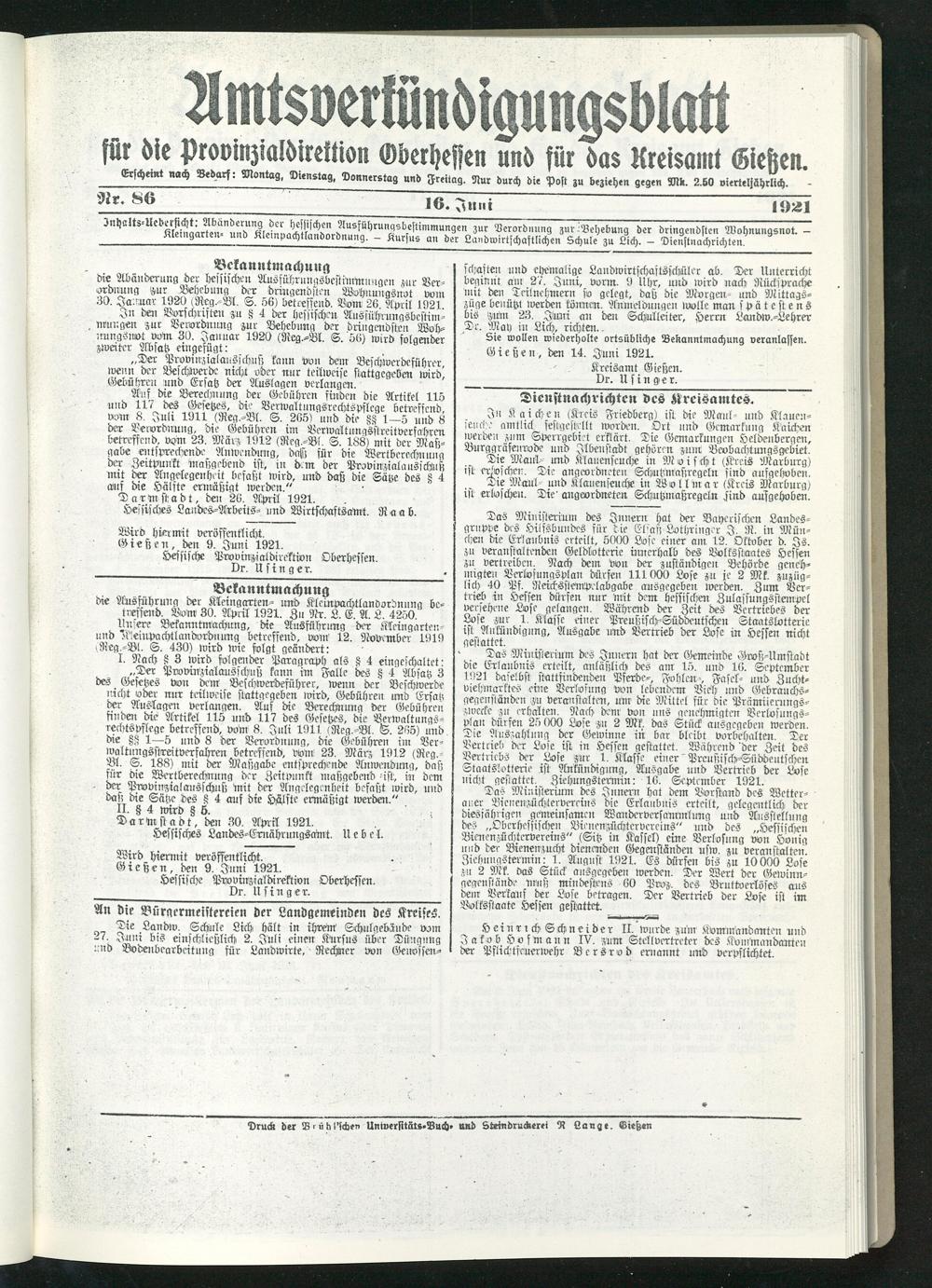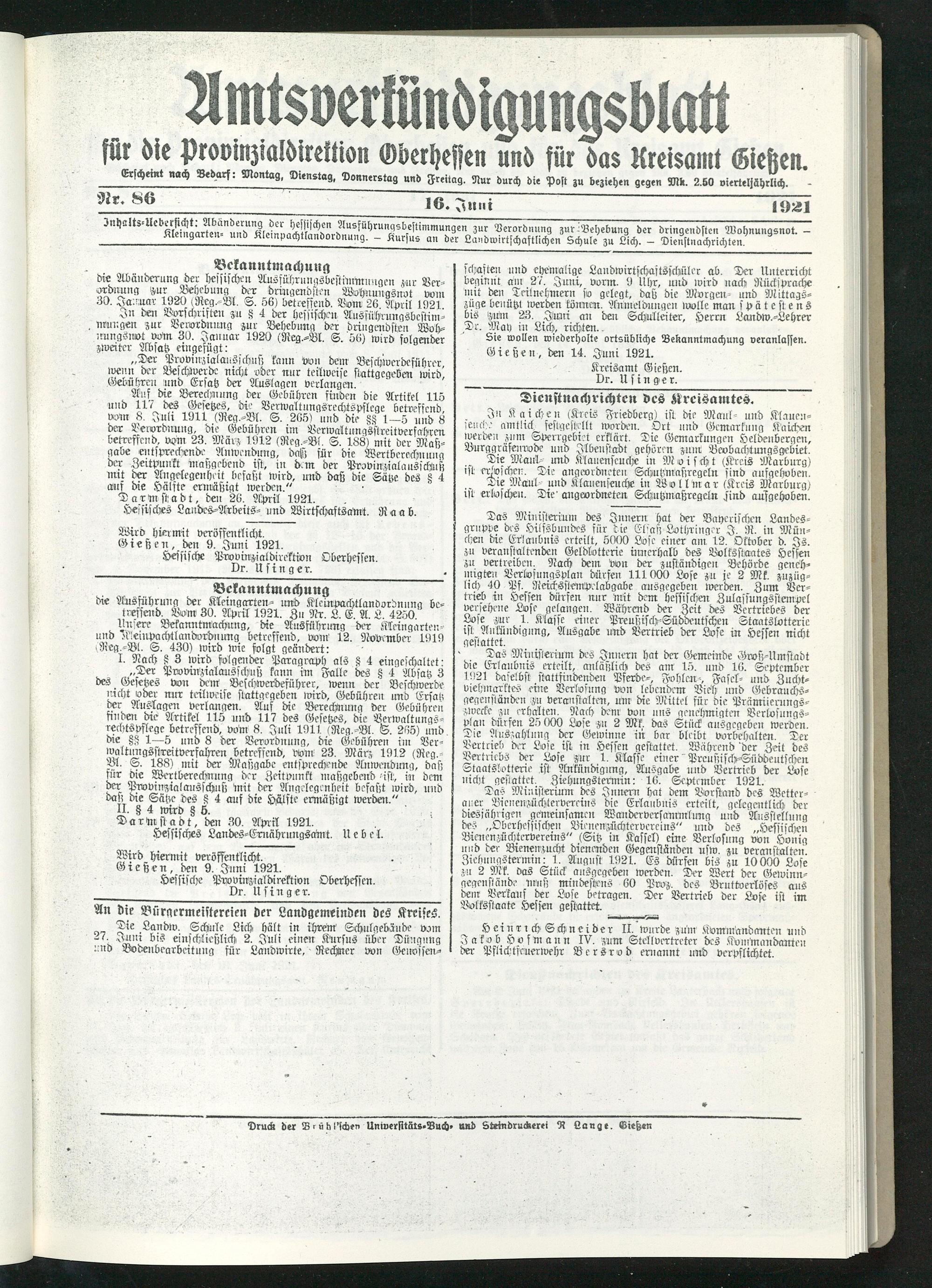 Amtsverkündigungsblatt für die Provinzialdirektion Oberhessen und der Kreisämter Gießen, Friedberg, Büdingen, Lauterbach, Schotten und Alsfeld. 1919-1937