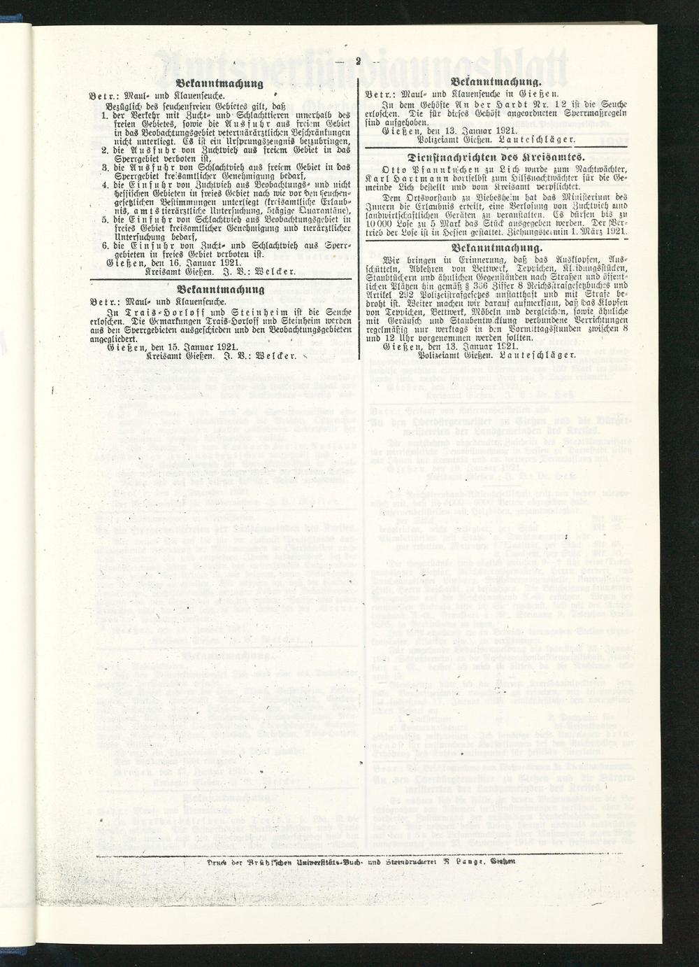 Amtsverkündigungsblatt für die Provinzialdirektion Oberhessen und der Kreisämter Gießen, Friedberg, Büdingen, Lauterbach, Schotten und Alsfeld. 1919-1937