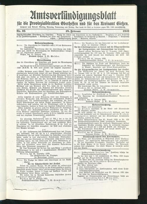 Amtsverkündigungsblatt für die Provinzialdirektion Oberhessen und der Kreisämter Gießen, Friedberg, Büdingen, Lauterbach, Schotten und Alsfeld. 1919-1937