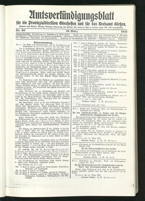 Amtsverkündigungsblatt für die Provinzialdirektion Oberhessen und der Kreisämter Gießen, Friedberg, Büdingen, Lauterbach, Schotten und Alsfeld. 1919-1937