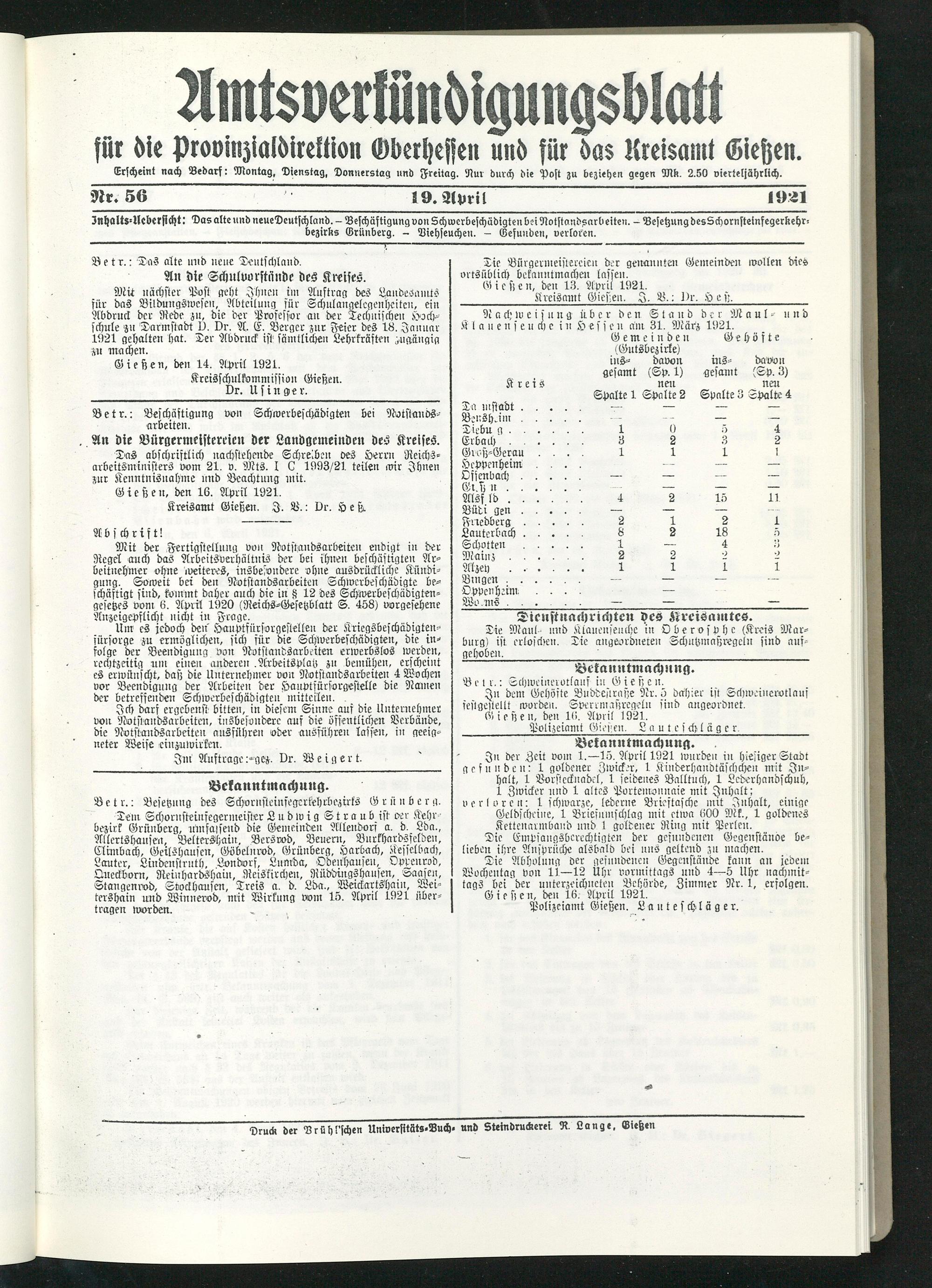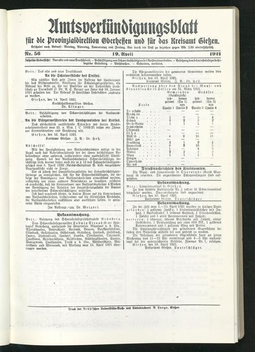 Amtsverkündigungsblatt für die Provinzialdirektion Oberhessen und der Kreisämter Gießen, Friedberg, Büdingen, Lauterbach, Schotten und Alsfeld. 1919-1937