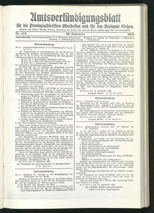 Amtsverkündigungsblatt für die Provinzialdirektion Oberhessen und der Kreisämter Gießen, Friedberg, Büdingen, Lauterbach, Schotten und Alsfeld. 1919-1937