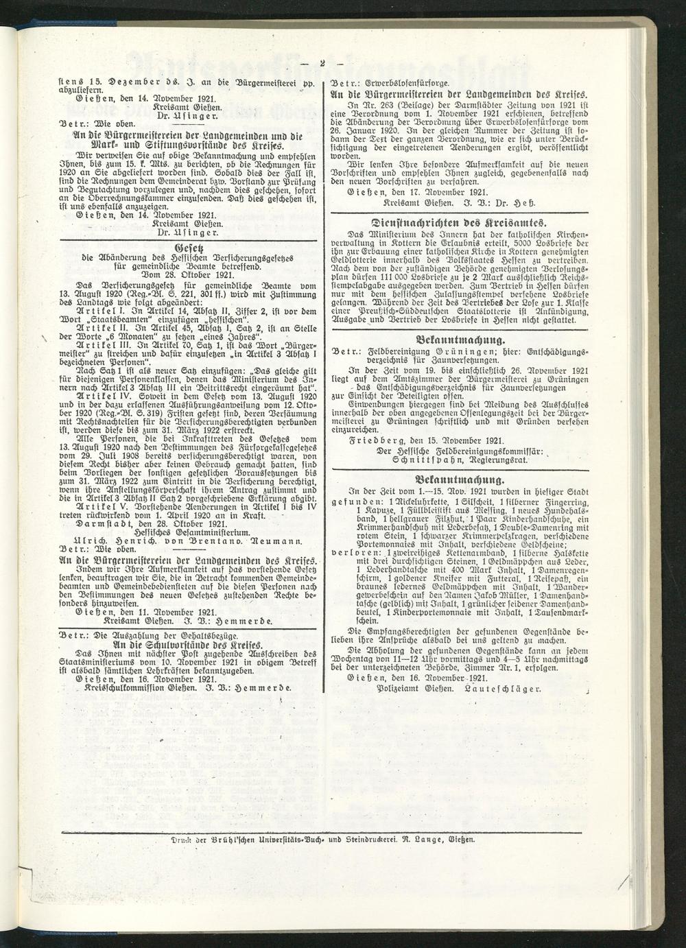 Amtsverkündigungsblatt für die Provinzialdirektion Oberhessen und der Kreisämter Gießen, Friedberg, Büdingen, Lauterbach, Schotten und Alsfeld. 1919-1937