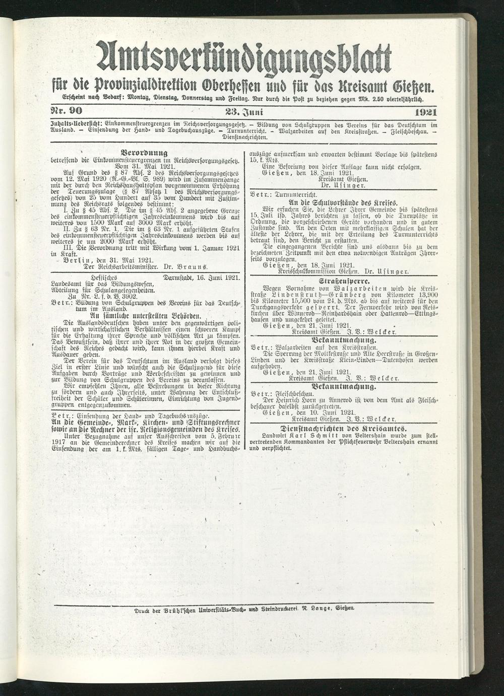 Amtsverkündigungsblatt für die Provinzialdirektion Oberhessen und der Kreisämter Gießen, Friedberg, Büdingen, Lauterbach, Schotten und Alsfeld. 1919-1937