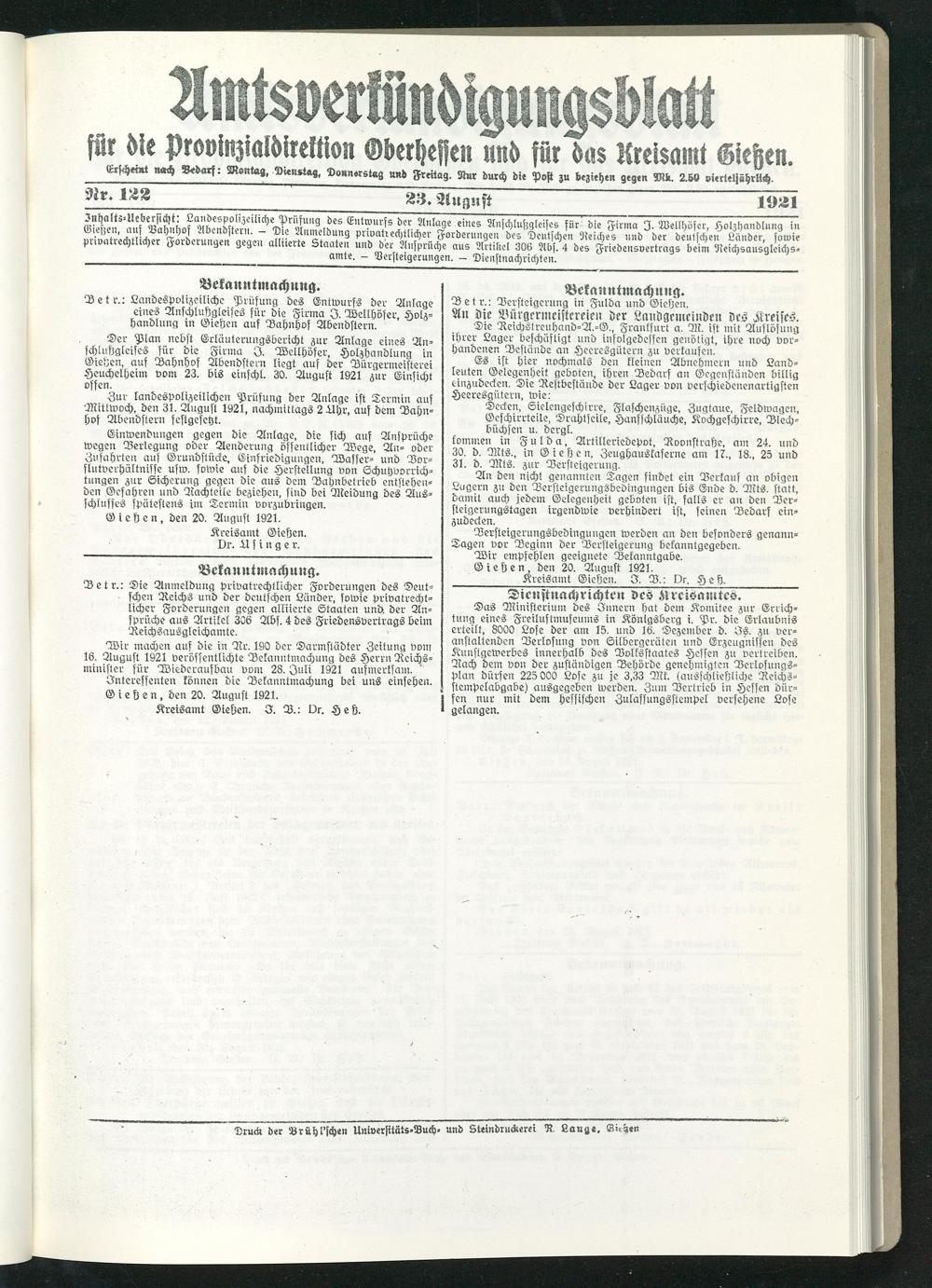 Amtsverkündigungsblatt für die Provinzialdirektion Oberhessen und der Kreisämter Gießen, Friedberg, Büdingen, Lauterbach, Schotten und Alsfeld. 1919-1937