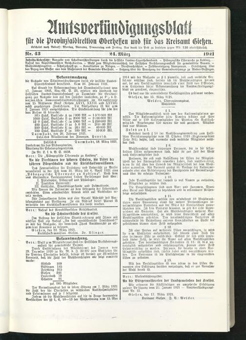 Amtsverkündigungsblatt für die Provinzialdirektion Oberhessen und der Kreisämter Gießen, Friedberg, Büdingen, Lauterbach, Schotten und Alsfeld. 1919-1937