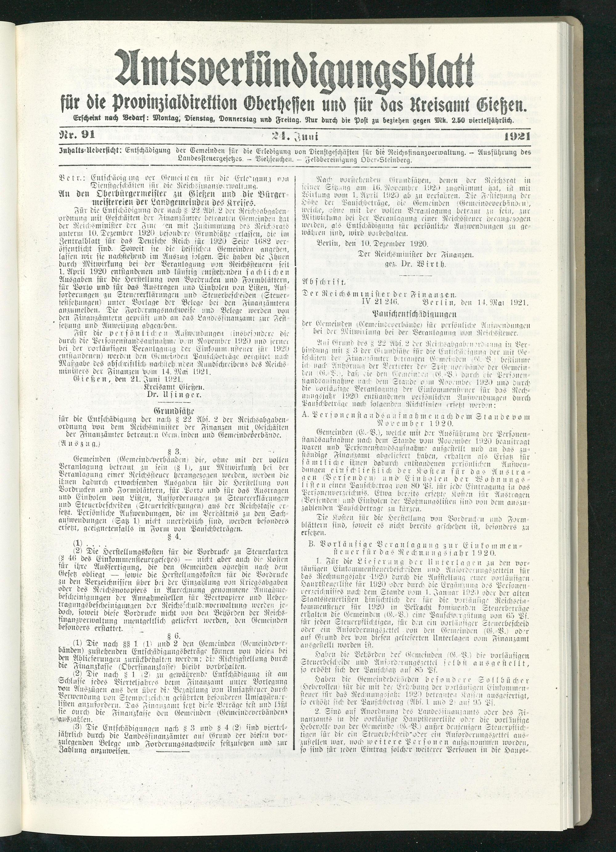 Amtsverkündigungsblatt für die Provinzialdirektion Oberhessen und der Kreisämter Gießen, Friedberg, Büdingen, Lauterbach, Schotten und Alsfeld. 1919-1937