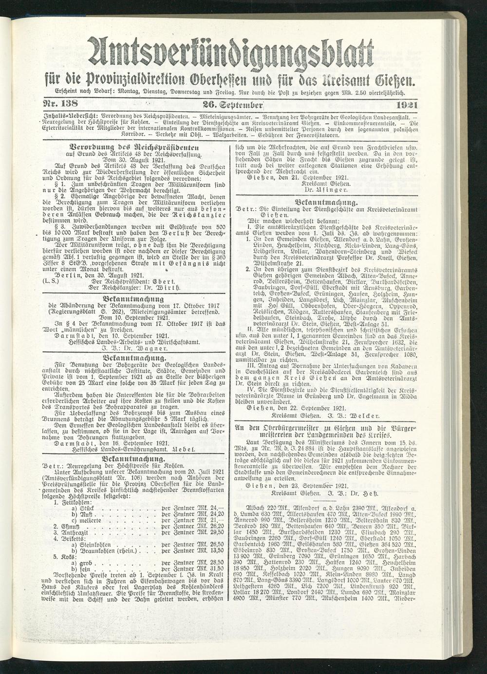 Amtsverkündigungsblatt für die Provinzialdirektion Oberhessen und der Kreisämter Gießen, Friedberg, Büdingen, Lauterbach, Schotten und Alsfeld. 1919-1937
