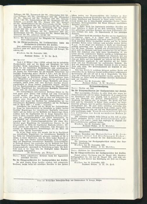Amtsverkündigungsblatt für die Provinzialdirektion Oberhessen und der Kreisämter Gießen, Friedberg, Büdingen, Lauterbach, Schotten und Alsfeld. 1919-1937